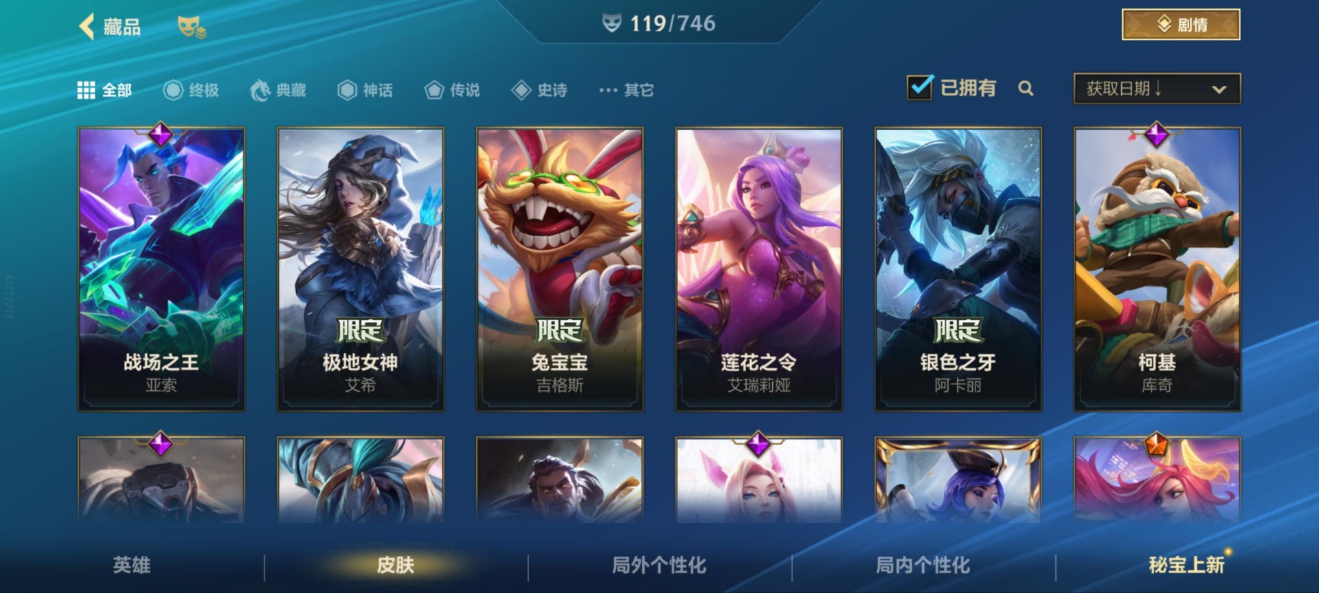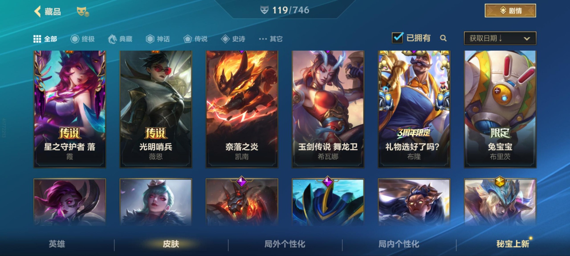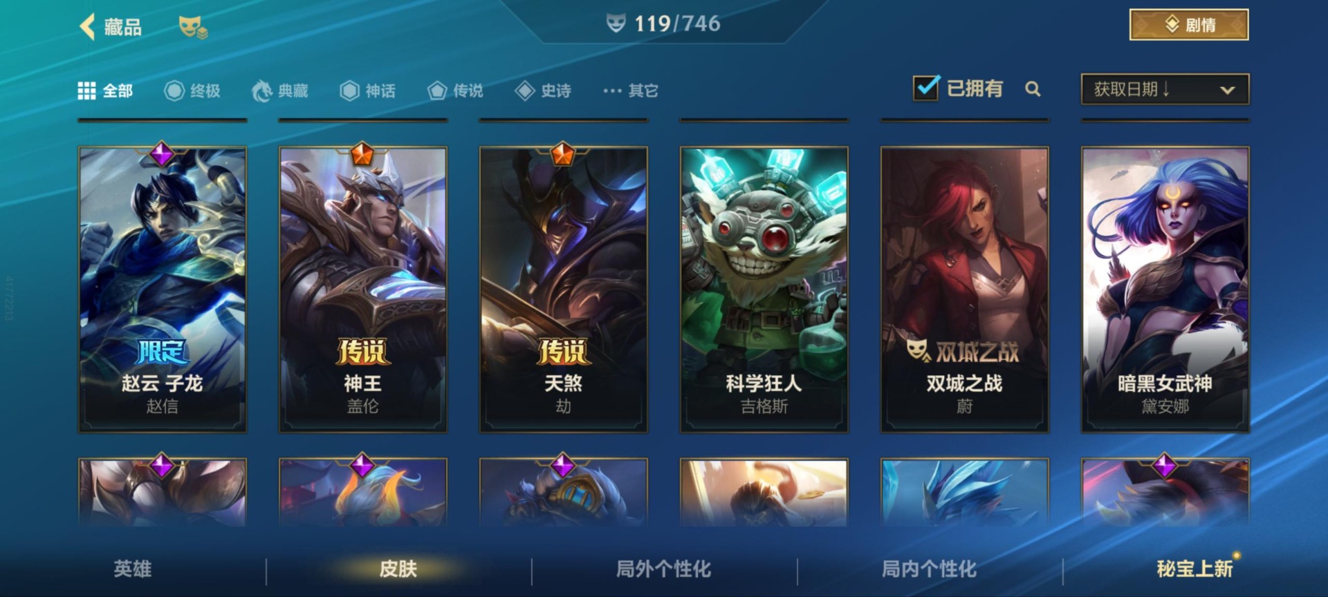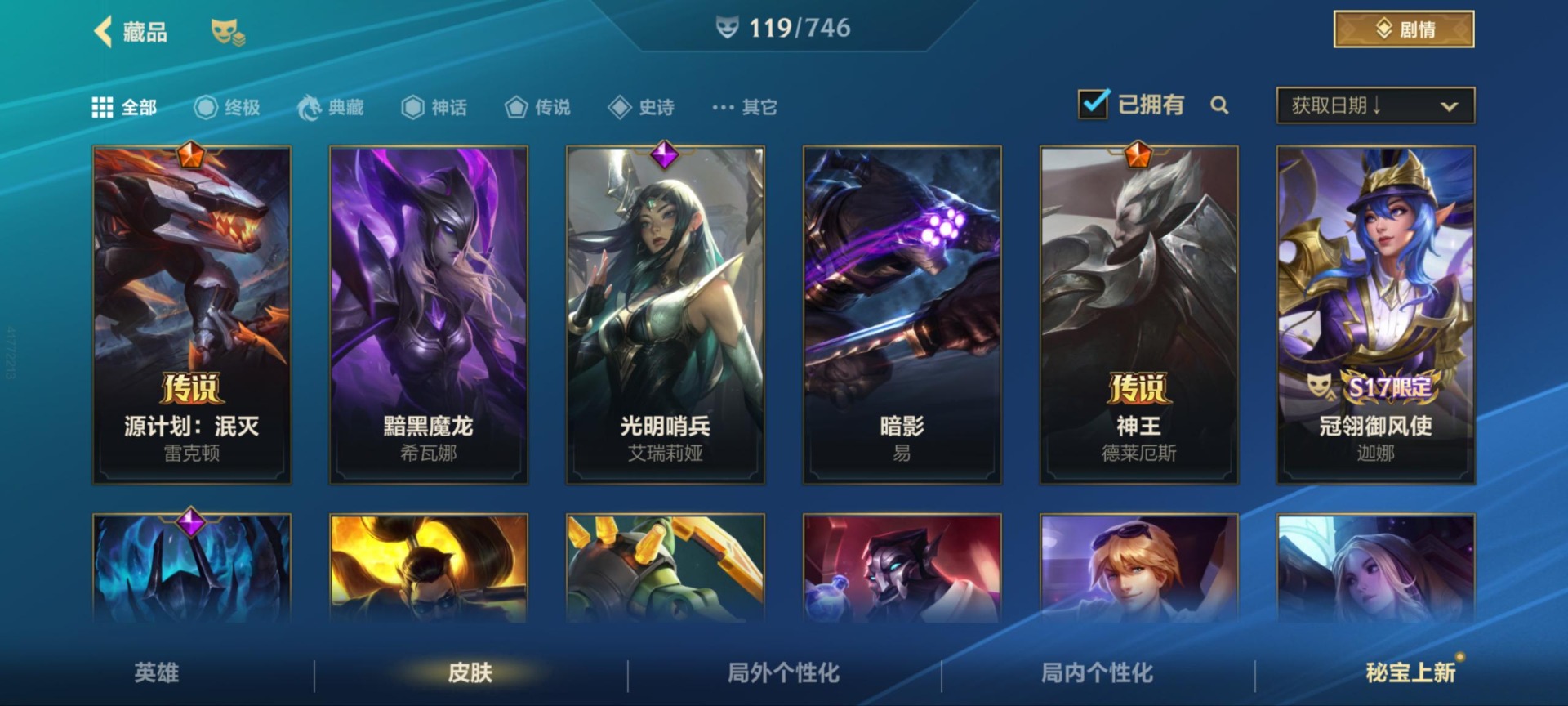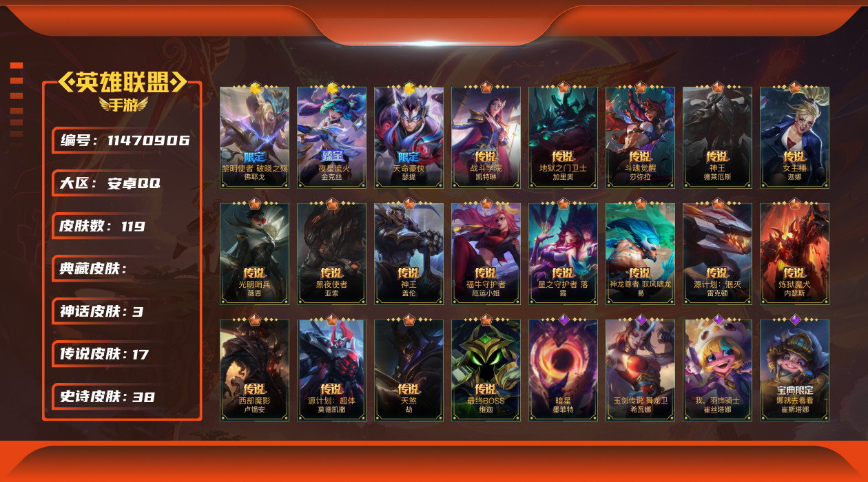 [11470906]17传说 38史诗 119皮肤 可二次 可修改实名 优质装备:福牛守护者女枪,光明哨兵薇恩,黑夜使者亚索,炼狱魔犬,女主播风女,神龙尊者 驭风啸龙,神王盖伦,神王诺手,天煞劫,西部魔影卢锡安,星之守护者 落,源计划:泯灭,最终BOSS维迦,斗魂觉醒 莎弥拉 段位:钻石 神话皮:夜星流火 金克丝,天命豪侠 瑟提,黎明使者 破晓之殇 佛耶戈 限定皮肤:赵云子龙,星之守护者霞,星之守护者洛,张辽文远,关羽云长 传说皮:战斗学院女警,源计划:超体,地狱之门卫士