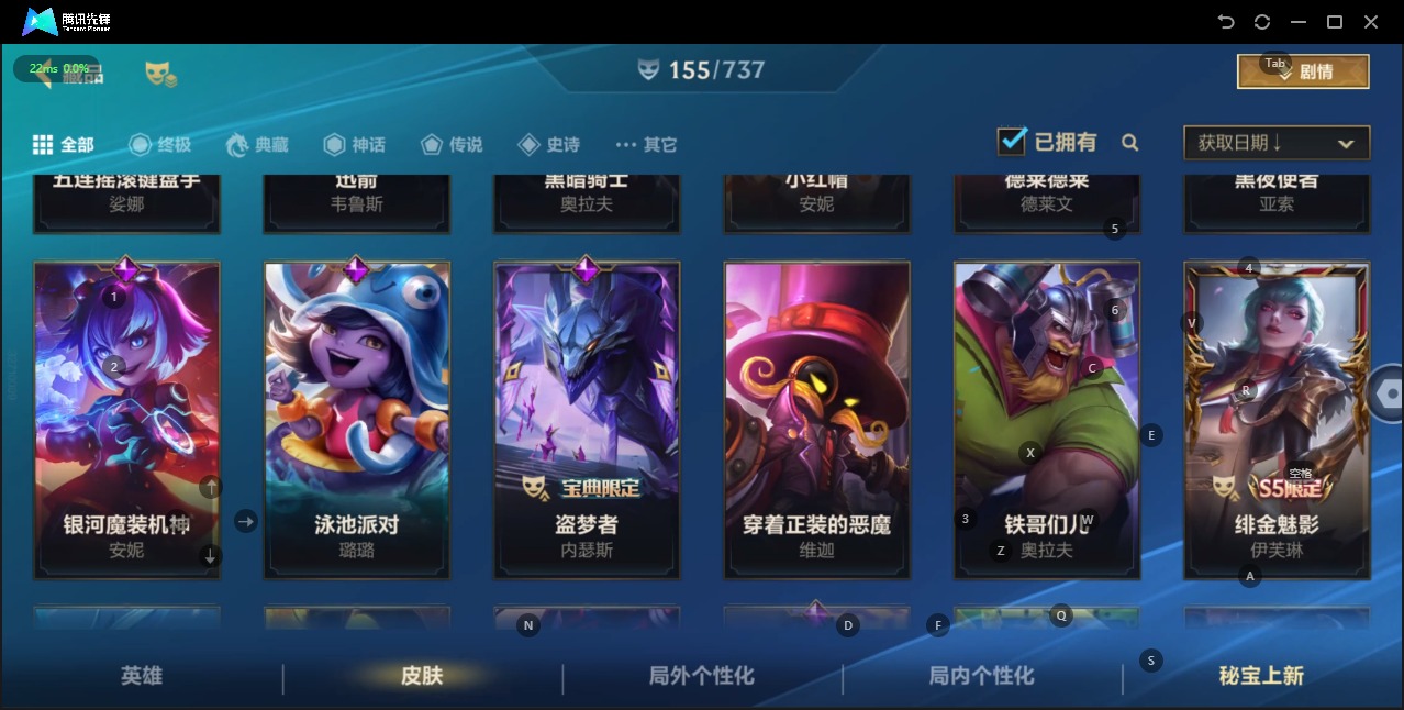 - [11884274]V7 1典藏 9传说 124英雄 222皮肤 可修改实名 优质装备:鸣剑·曳影,末日机甲-孙尚香(绿蚂蚱),地狱火,仲夏夜之梦(大飞蛾),地狱之眼,超时空战士-狄仁杰,涂山容容 珍宝阁皮:女武神,玩趣恶龙 限定皮:鸣野蒿,凤求凰(白切鸡),武陵仙君(小桃花),高山流水,五谷丰年,游园惊梦,逐梦之星,李小龙,永曜之星,辉光之辰,霸王别姬-项羽,霸王别姬-虞姬,青春决赛季,云端筑梦师 史诗皮:星界战将,百相守梦-周瑜,破空之剑,蔬乡物语(鲁班七号),百相守梦-黄忠,紫霞仙子,苍穹之光,电玩小子(小书包),黄金分割率,特工魅影,千年之狐,江河有灵,魅语,百解令(蒙犽),高渐离燃音魔法,冰冠公主,青蛇,偶像歌手,暗夜猫娘,龙骑士(小龙虾),乱世虎臣,节奏热浪,修罗,女仆咖啡,水果甜心,星夜王子,心灵骇客,功夫厨神,德古拉伯爵,暗隐猎兽者,幽灵船长,鬼剑武藏,暗渊魔法,心灵战警,拒霜思,缤纷独角兽,乘风破浪,逐浪之夏,水晶猎龙者,曙光守护者,原初追逐者,圣诞狂欢,圣诞恋歌,鹰眼统帅,暗夜贵公子,魅力维加斯,黎明之约,无心