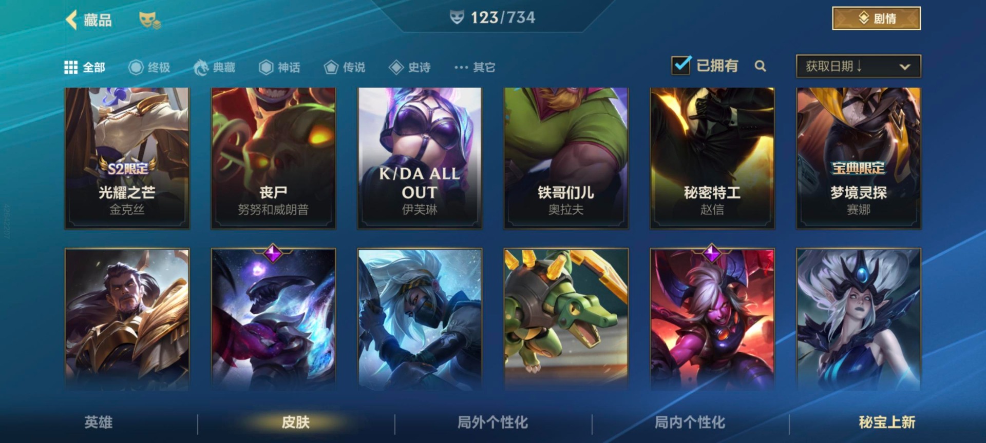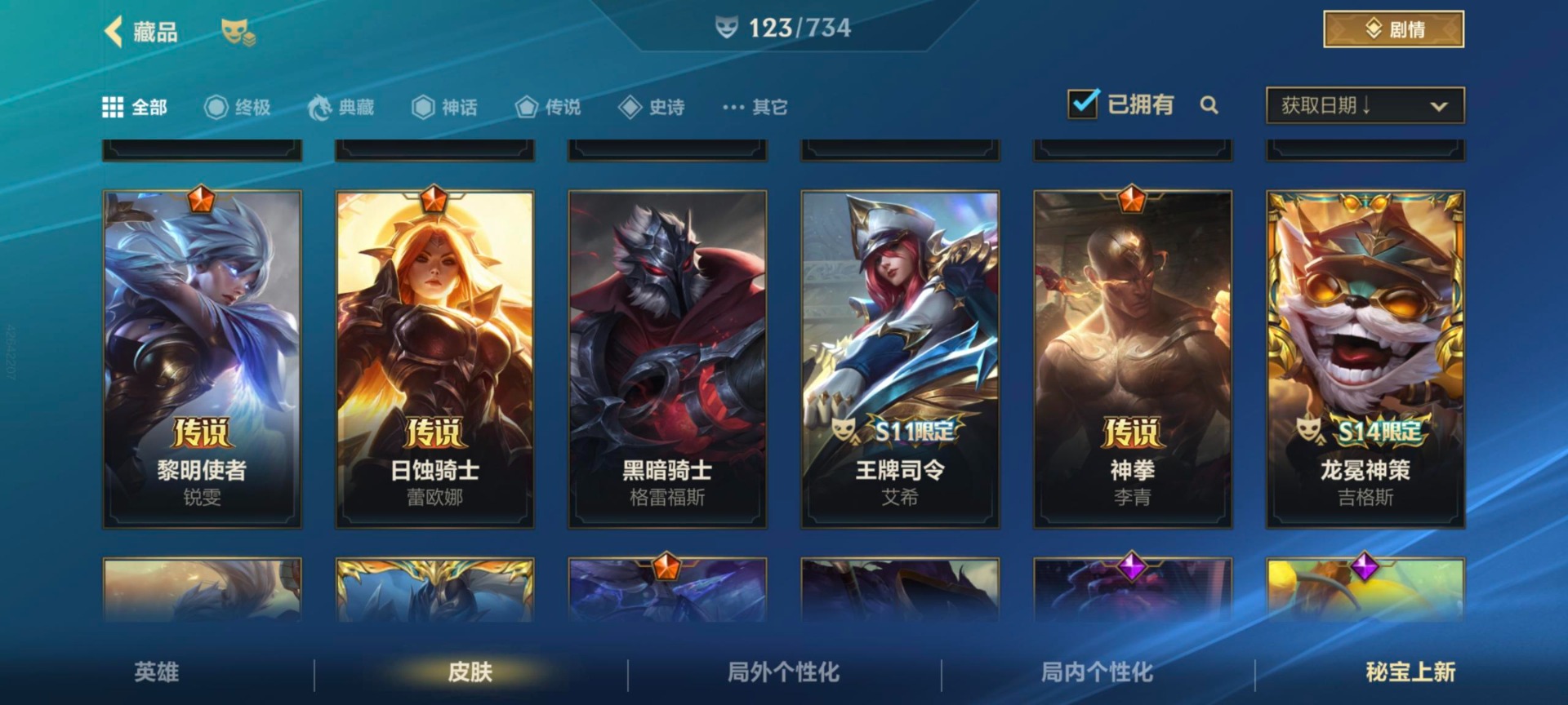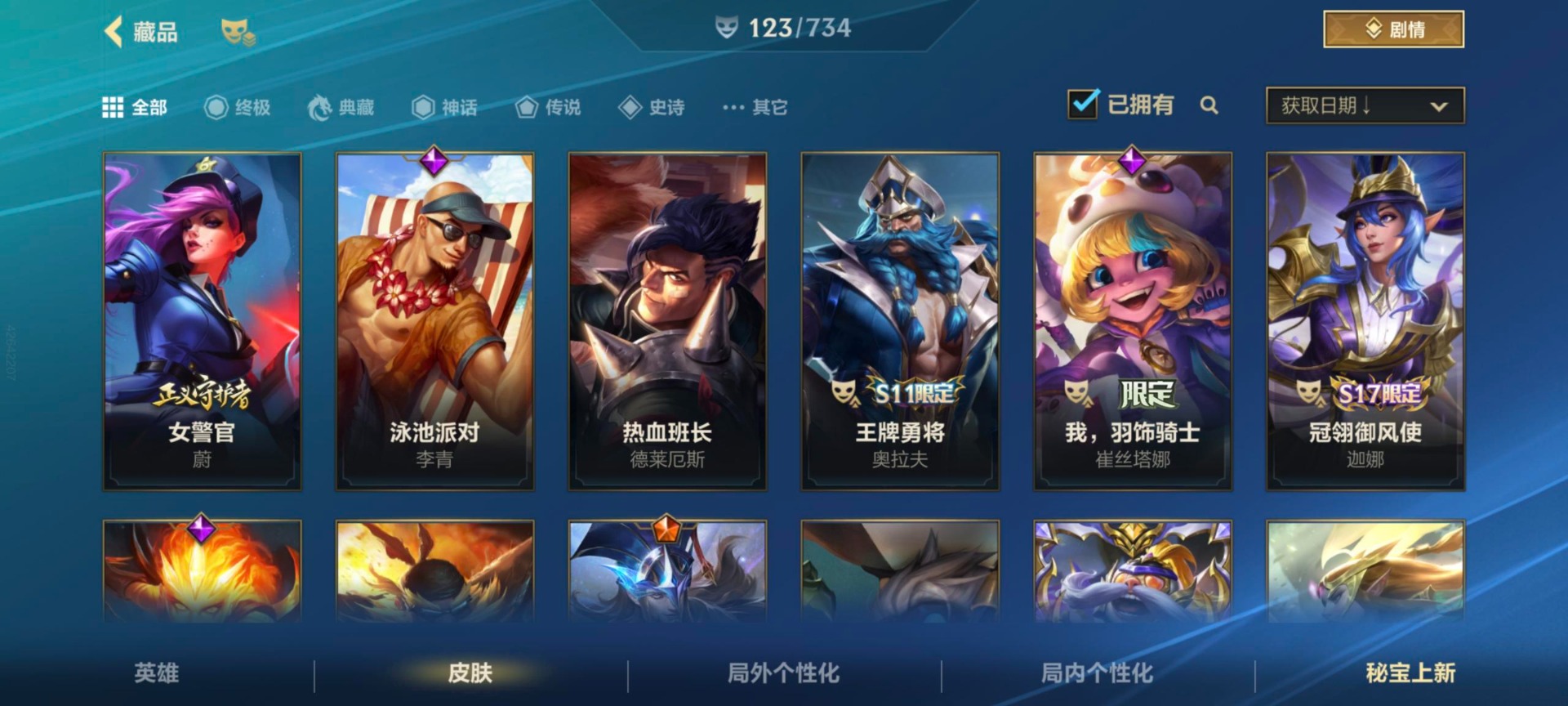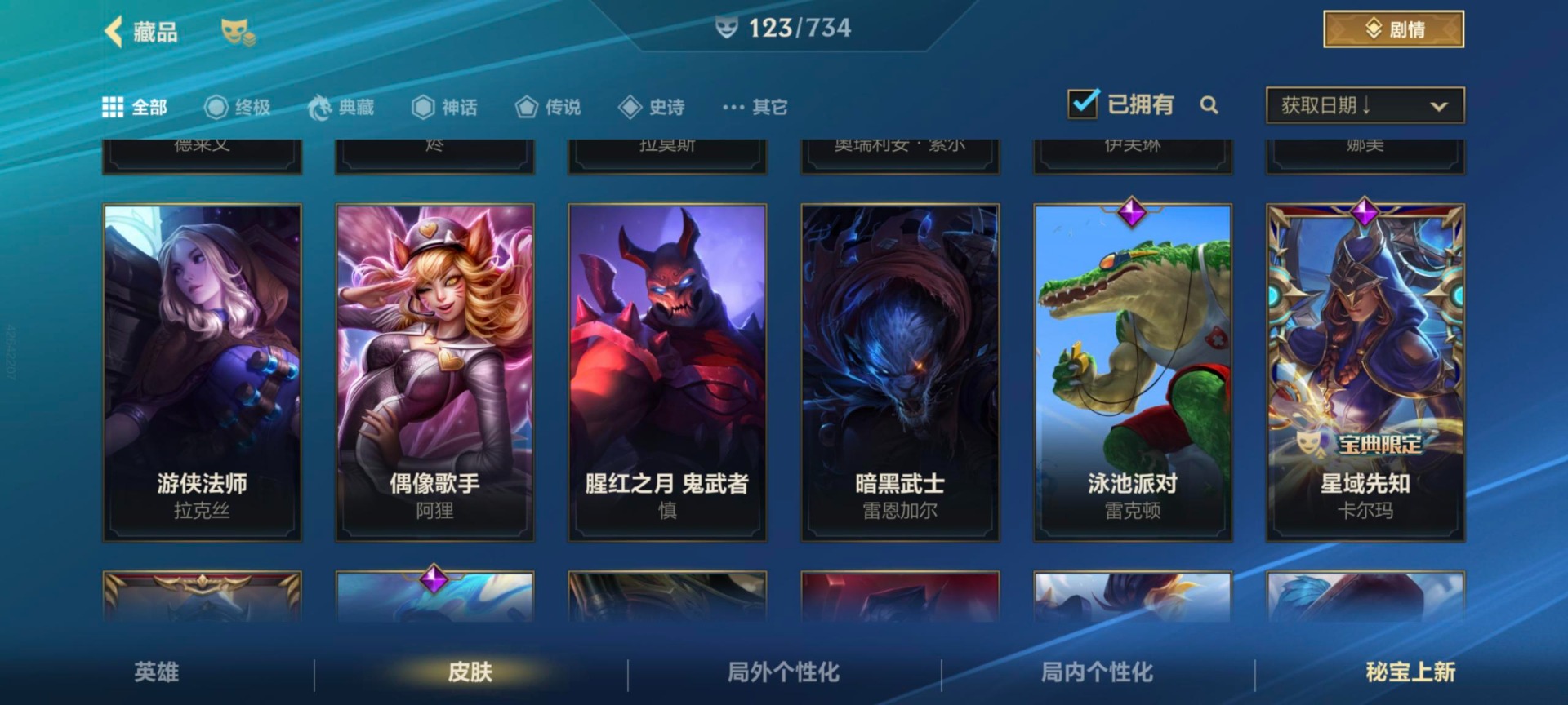 - [6856406]实名: 不可修改 贵族等级: V7 英雄数: 121 皮肤数: 190 传说皮: 云鹰飞将,仲夏夜之梦,霜月吟,典韦战鼓燎原,玄雷天君,幻光神枪 限定皮: 冰锋战神,李小龙,祈雪灵祝,游园惊梦,御风骁将,武圣,飞衡,至尊宝,五谷丰年,影龙天霄,愿照·山河定,愿照·九州拓