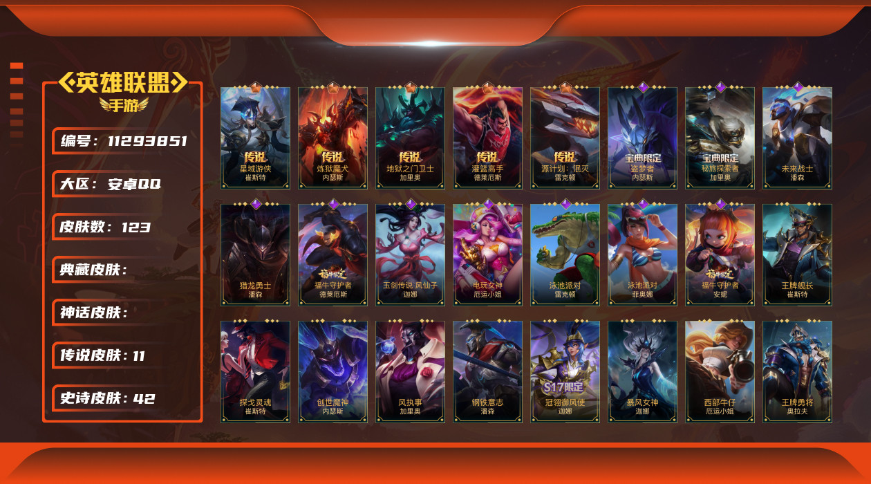 [11293851]可二次 可修改实名 11传说 42史诗 123皮肤 127英雄 翡翠 皮肤:崔斯特-王牌舰长,崔斯特-星域游侠,崔斯特-探戈灵魂,崔斯特-腥红之月,内瑟斯-盗梦者,内瑟斯-单身贵族,内瑟斯-创世魔神,内瑟斯-炼狱魔犬,加里奥-秘旅探索者,加里奥-风执事,加里奥-地狱之门卫士,潘森-未来战士,潘森-钢铁意志,潘森-猎龙勇士,布隆-龙冕御盾,布隆-猛虎,布隆-猎龙勇士,德莱厄斯-福牛守护者,德莱厄斯-热血班长,德莱厄斯-灌篮高手,迦娜-冠翎御风使,迦娜-暴风女神,迦娜-玉剑传说 风仙子,厄运小姐-女帝,厄运小姐-西部牛仔,厄运小姐-电玩女神,雷克顿-源计划:泯灭,雷克顿-鳄霸,雷克顿-泳池派对,奥拉夫-王牌勇将,奥拉夫-猎龙勇士,奥拉夫-铁哥们儿,菲奥娜-绯金丽刃,菲奥娜-泳池派对,菲奥娜-皇家守卫,安妮-福牛守护者,安妮-小红帽,安妮-冰霜烈焰,贾克斯-光明骑士,贾克斯-宗师级钓鱼训练师,贾克斯-武神,蕾欧娜-烧烤女神,蕾欧娜-日蚀骑士,蕾欧娜-泳池派对,德莱文-绯金战斧,德莱文-破败军团,德莱文-德莱德莱,李青-地下拳王,李青-泳池派对,李青-神拳,伊芙琳-绯金魅影,伊芙琳-K/DA ALL OUT,赛娜-梦境灵探,赛娜-西部天使,嘉文四世-王牌上将,嘉文四世-孤胆英豪,蔚-女警官,蔚-炼狱魔女,提莫-小蜜蜂,提莫-熊猫,库奇-冠翎飞行员,库奇-电玩上校,崔丝塔娜-我,羽饰骑士,崔丝塔娜-游击队员,莫甘娜-刀锋女王,莫甘娜-魅惑女巫,奥瑞利安·索尔-灰烬领主,奥瑞利安·索尔-霸天龙神,格雷福斯-绝命机甲,格雷福斯-黑暗骑士,赵信-龙冕先锋,赵信-秘密特工,泰达米尔-光耀之刃,泰达米尔-国王,努努和威朗普-丧尸,努努和威朗普-脏兮兮,艾希-王牌司令,艾希-极地女神,墨菲特-暗星,墨菲特-无畏号,娜美-绯金鲛灵,娜美-玉剑传说 寒潭夭夭,伊泽瑞尔-冰川勇者,维迦-最终BOSS,盖伦-钢铁军团,辛吉德-炼金狂士,卡特琳娜-海贼魅影,艾瑞莉娅-冰霜之刃,韦鲁斯-暗星,锐雯-黎明使者,拉克丝-游侠法师,阿木木-惊悚派对,古拉加斯-飞车暴走族,吉格斯-龙冕神策,菲兹-绒毛