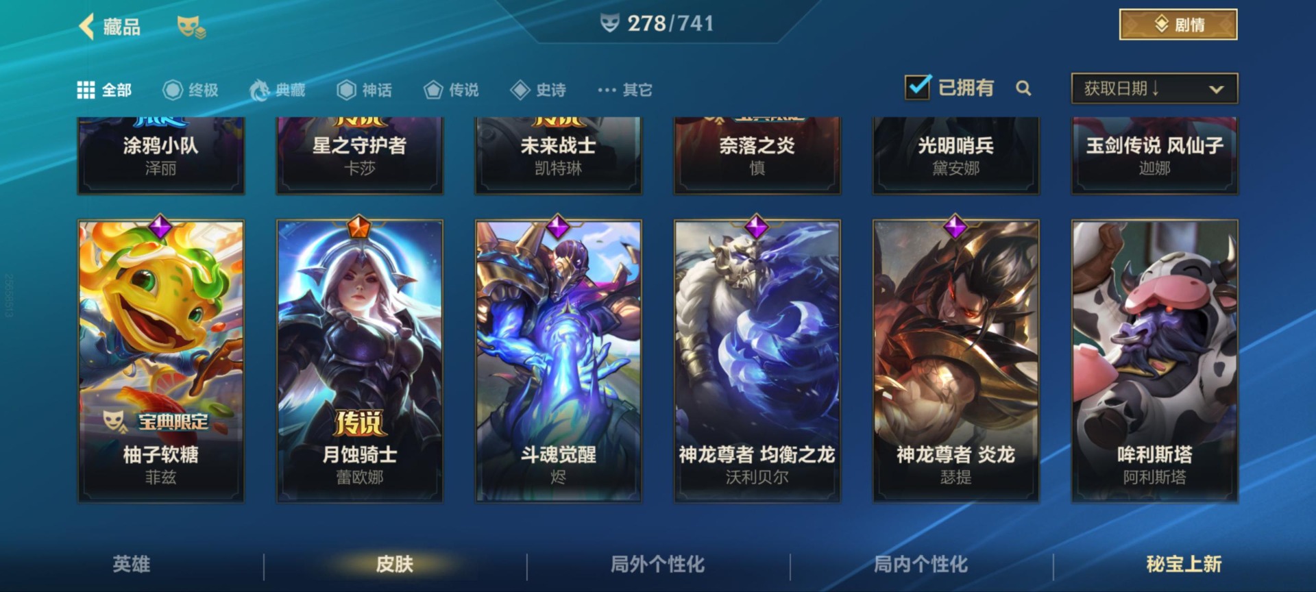 - PX_2099306-?万象图鉴·2典藏·时雨天司·青龙志】【可二次】ASYw13209-安卓Q-124英雄-239皮肤-180铭文-贵族积分5w【贵族8】【2典藏·2星传说·8传说·1天幕·2按键】【因赛季更新游戏段付以上号为准!】 【荣耀典藏】:孙悟空全息碎影,韩信弑枪猎影 【星元皮肤】:狄仁杰星际治安官,孙悟空幽冥火 【天幕】:财神纳福天幕 【内测皮肤】:孙尚香蔷薇恋人,高渐离玩趣恶龙,狂铁