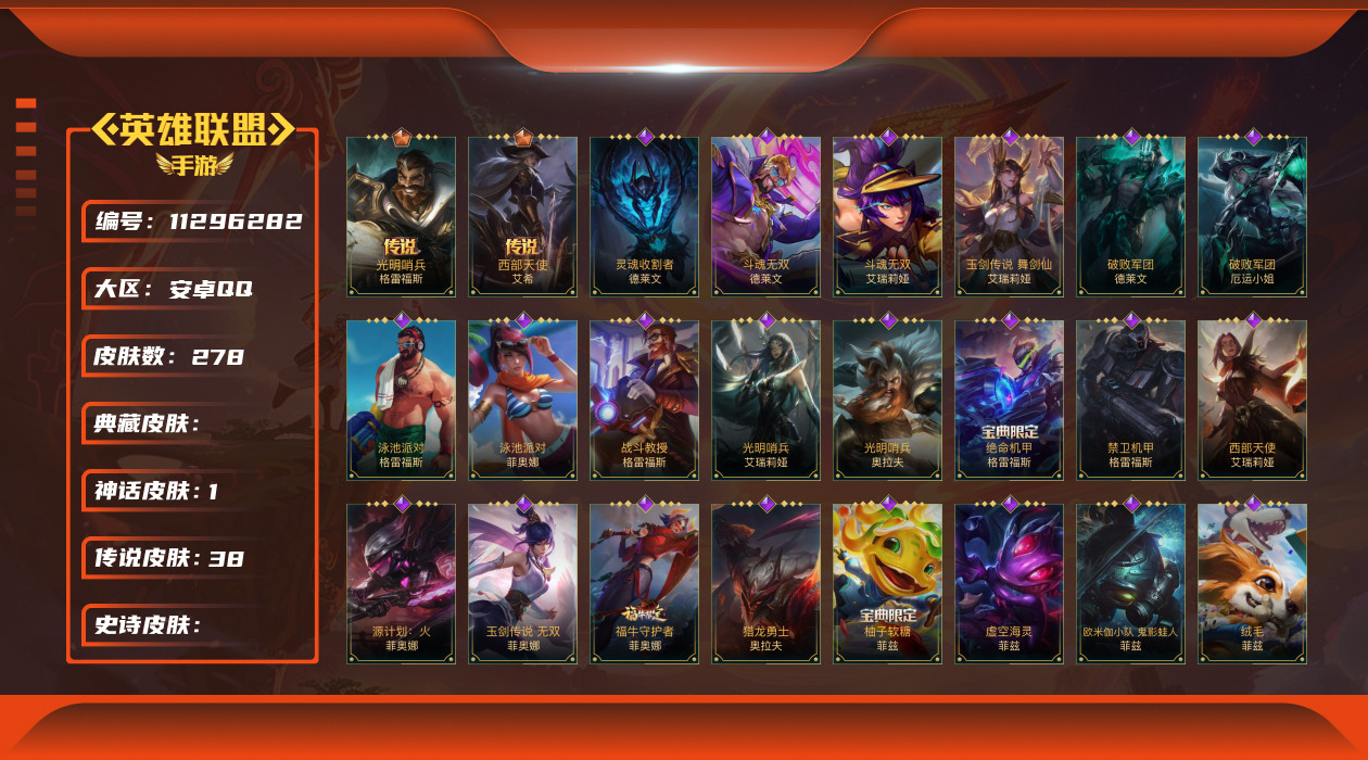 [11296282]可二次 可修改实名 1神话 38传说 141史诗 278皮肤 129英雄 铂金 皮肤:德莱文-灵魂收割者,德莱文-金牌主播,德莱文-斗魂无双,德莱文-破败军团,德莱文-绯金战斧,德莱文-德莱德莱,格雷福斯-泳池派对,格雷福斯-战斗教授,格雷福斯-光明哨兵,格雷福斯-绝命机甲,格雷福斯-末路教父,格雷福斯-禁卫机甲,艾瑞莉娅-莲花之令,艾瑞莉娅-光明哨兵,艾瑞莉娅-西部天使,艾瑞莉娅-斗魂无双,艾瑞莉娅-玉剑传说 舞剑仙,艾瑞莉娅-冰霜之刃,菲奥娜-源计划:火,菲奥娜-玉剑传说 无双,菲奥娜-泳池派对,菲奥娜-绯金丽刃,菲奥娜-福牛守护者,菲奥娜-皇家守卫,奥拉夫-黑暗骑士,奥拉夫-猎龙勇士,奥拉夫-光明哨兵,奥拉夫-五连摇滚鼓手,奥拉夫-王牌勇将,奥拉夫-铁哥们儿,艾希-王牌司令,艾希-西部天使,艾希-极地女神,艾希-女皇,艾希-黑暗骑士,菲兹-柚子软糖,菲兹-兔宝宝,菲兹-虚空海灵,菲兹-欧米伽小队 鬼影蛙人,菲兹-绒毛,厄运小姐-女帝,厄运小姐-魅惑女巫,厄运小姐-破败军团,厄运小姐-星之守护者,厄运小姐-西部牛仔,烬-斗魂觉醒