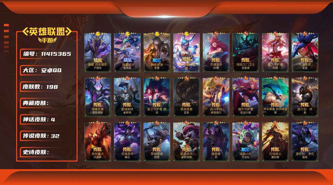 [11415365]3神话 32传说 85史诗 198皮肤 129英雄 钻石 可二次 可修改实名 优质装备:暗星尊,福牛守护者女枪,灌篮高手,光明哨兵薇恩,黑夜使者亚索,黎明使者锐雯,炼狱魔犬,欧米伽小队 幽灵特工,日蚀骑士蕾欧娜,神龙尊者 驭风啸龙,神拳盲僧,星域游侠卡牌,星之守护者金克丝,星之守护者阿狸,星之守护者 落,星之守护者 陨,驯龙炮手,源计划:净化,源计划:联合,战斗学院ez,玉剑传说 武剑仙,灵魂莲华锤石,涂鸦小队莎弥拉,源计划:林,源计划:泯灭,最终BOSS维迦,灵魂莲华阿狸 段位:钻石 神话皮:夜星流火 金克丝,臻藏西部魔影卢锡安,乘龙破渊 李青,臻藏 翩翩绣蕊 霞 限定皮肤:星之守护者霞,星之守护者洛,关羽云长,涂鸦小队莎弥拉 传说皮:太空律动机器人,翩翩绣蕊 霞,海魔至尊 亚托克斯,斗魂无双亚索,地狱之门卫士,黎明使者永恩