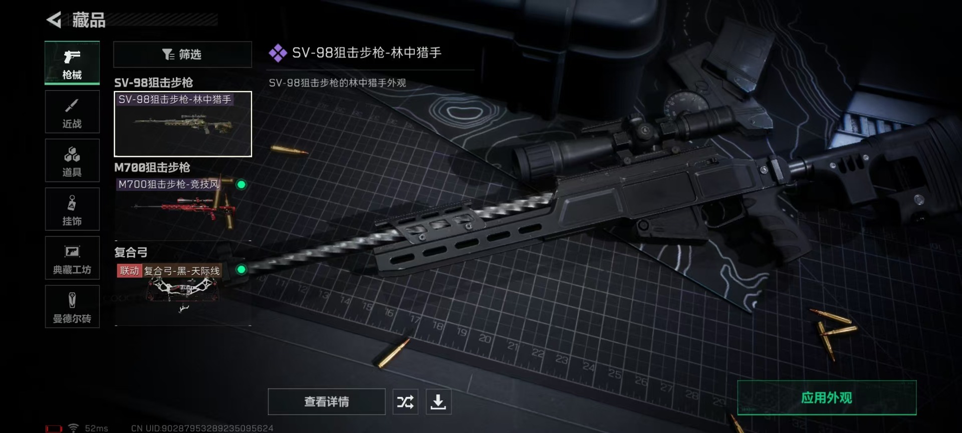 [11471395]总资产:59.9 1传说枪械 可二次 可修改实名 烽火地带段位:青铜 全面战场段位:列兵 哈夫币:29.120 传说武器皮肤:复合弓-黑-天际线 史诗武器皮肤:SV-98狙击步枪-林中猎手,M700狙击步枪-竞技风