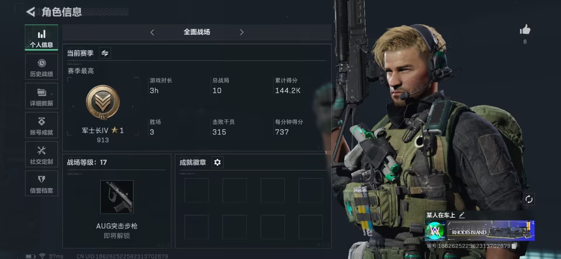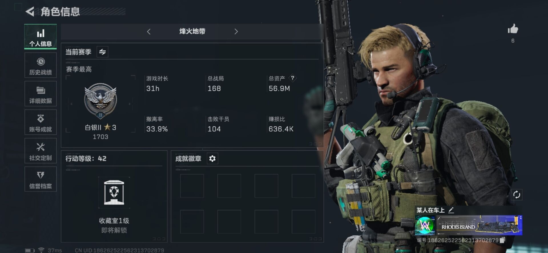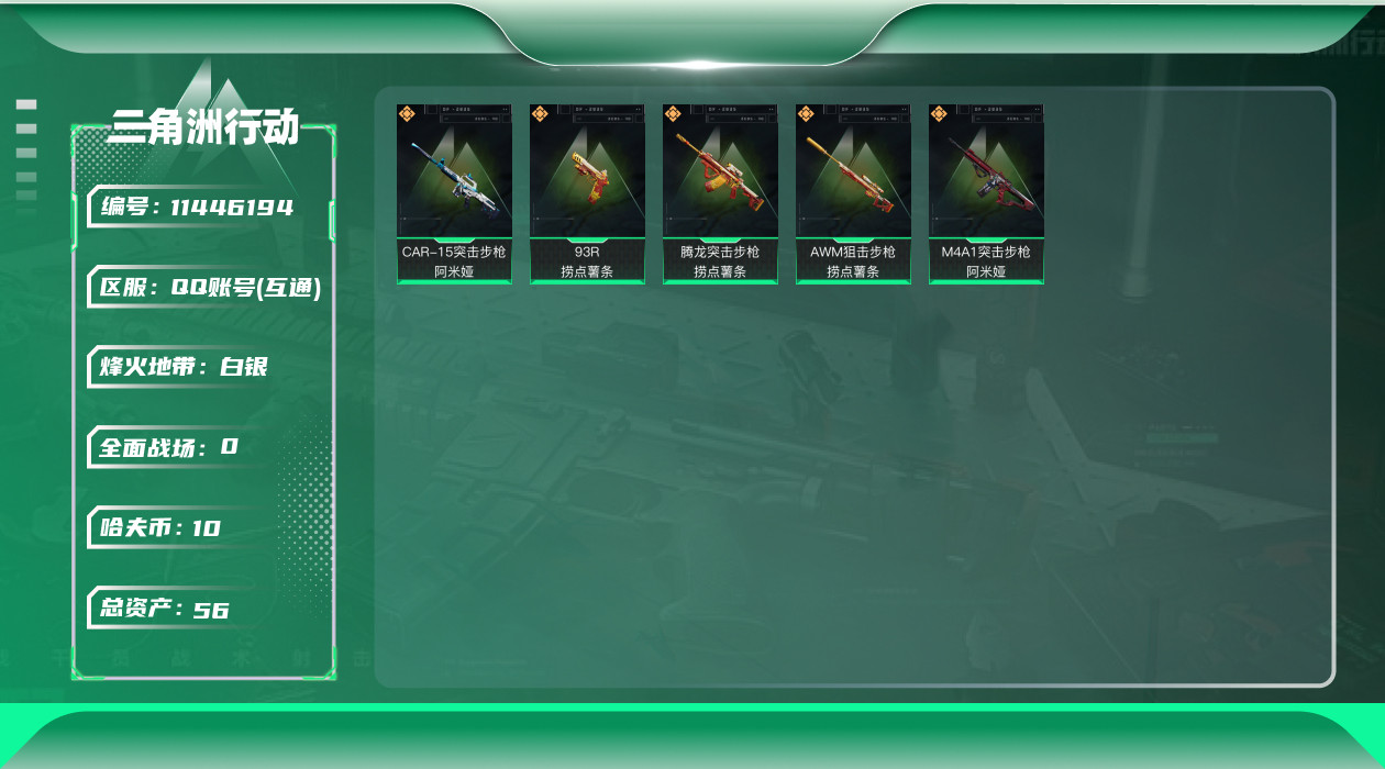 [11446194]总资产:56.9M 5传说枪械 哈夫币:10.088K 可二次 可修改实名 烽火地带段位:白银 全面战场段位:军士长 传说武器皮肤:M4A1突击步枪-阿米娅,CAR-15突击步枪-阿米娅,AWM狙击步枪-捞点薯条,腾龙突击步枪-捞点薯条,93R-捞点薯条