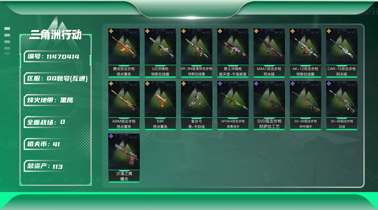 [11470414]总资产:113.4M 10传说枪械 哈夫币:41.705K 可二次 可修改实名 优质装备:顶级安全箱(3x3) 烽火地带段位:黑鹰 全面战场段位:无段位 传说武器皮肤:93R-捞点薯条,AWM狙击步枪-捞点薯条,腾龙突击步枪-捞点薯条,AK-12突击步枪-特斯拉线圈,CAR-15突击步枪-阿米娅,SR-3M紧凑突击步枪-特斯拉线圈,UZI冲锋枪-特斯拉线圈,勇士冲锋枪-能天使-午夜邮差,复合弓-黑-天际线,M4A1突击步枪-阿米娅 史诗武器皮肤:M16A4突击步枪-竞赛选手,SV-98狙击步枪-林中猎手,SV-98狙击步枪-囚徒,沙漠之鹰-曙光,SVD狙击步枪-阿萨拉工艺