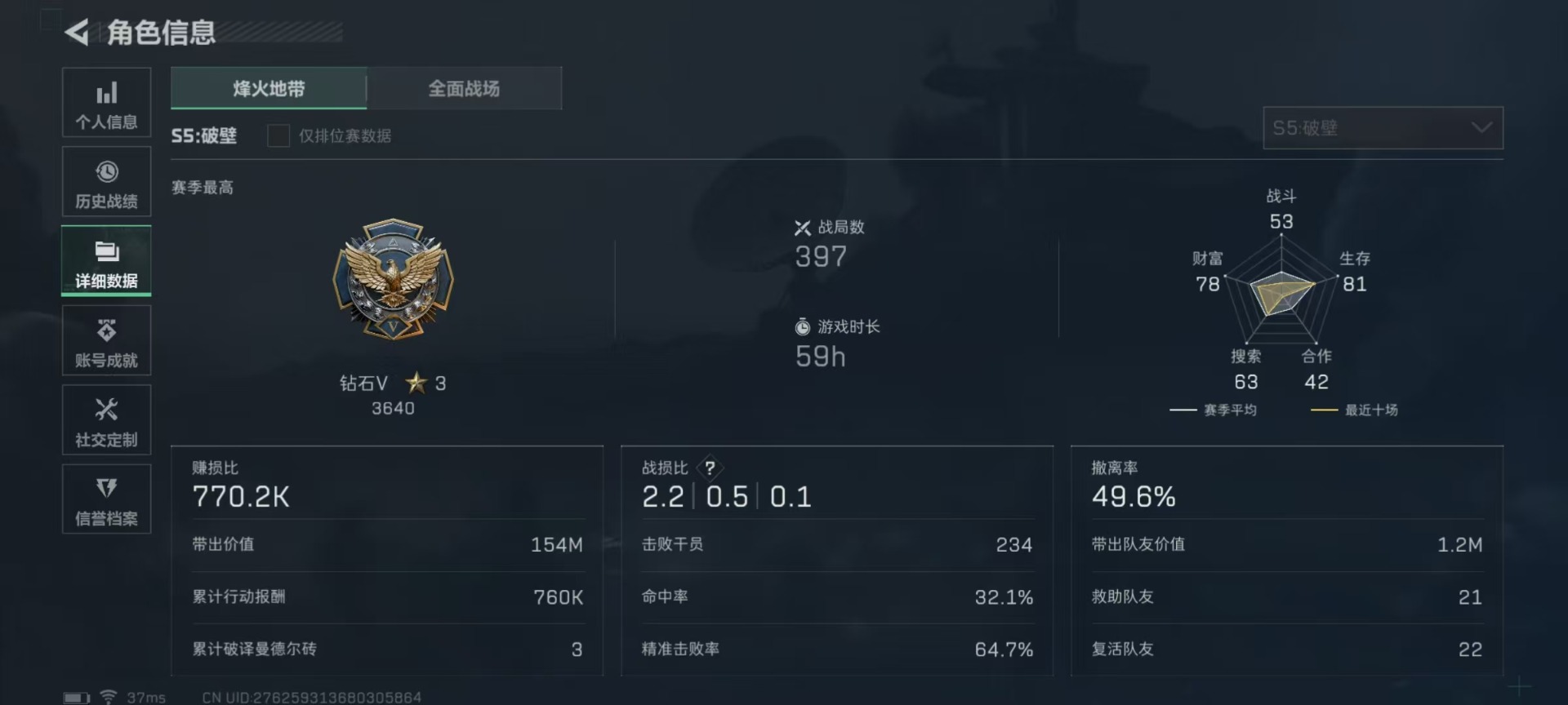 - [11296714]总资产:348.9 1干员外观 1近战传说 4传说枪械 可二次 可修改实名 优质装备:近战-北极星,顶级安全箱(3x3) 烽火地带段位:青铜 全面战场段位:无段位 哈夫币:223 传说武器皮肤:复合弓-黑-天际线,CAR-15突击步枪-阿米娅,725双管霰弹枪-送葬人-无题密令 史诗武器皮肤:PKM通用机枪-荒野求生,MP5冲锋枪-深海恐惧,SR-3M紧凑突击步枪-荒野求生,AKM突击步枪-林中猎手,SVD狙击步枪-荒野求生,M1014霰弹枪-林中猎手,PTR-32突击步枪-英雄,PSG-1射手步枪-无垢,AS Val突击步枪-典狱官,腾龙突击步枪-无垢,MP7冲锋枪-无垢 干员外观:蜂医-送葬人·无题密令(S5) 亮点:近战-北极星,顶级安全箱(3x3)