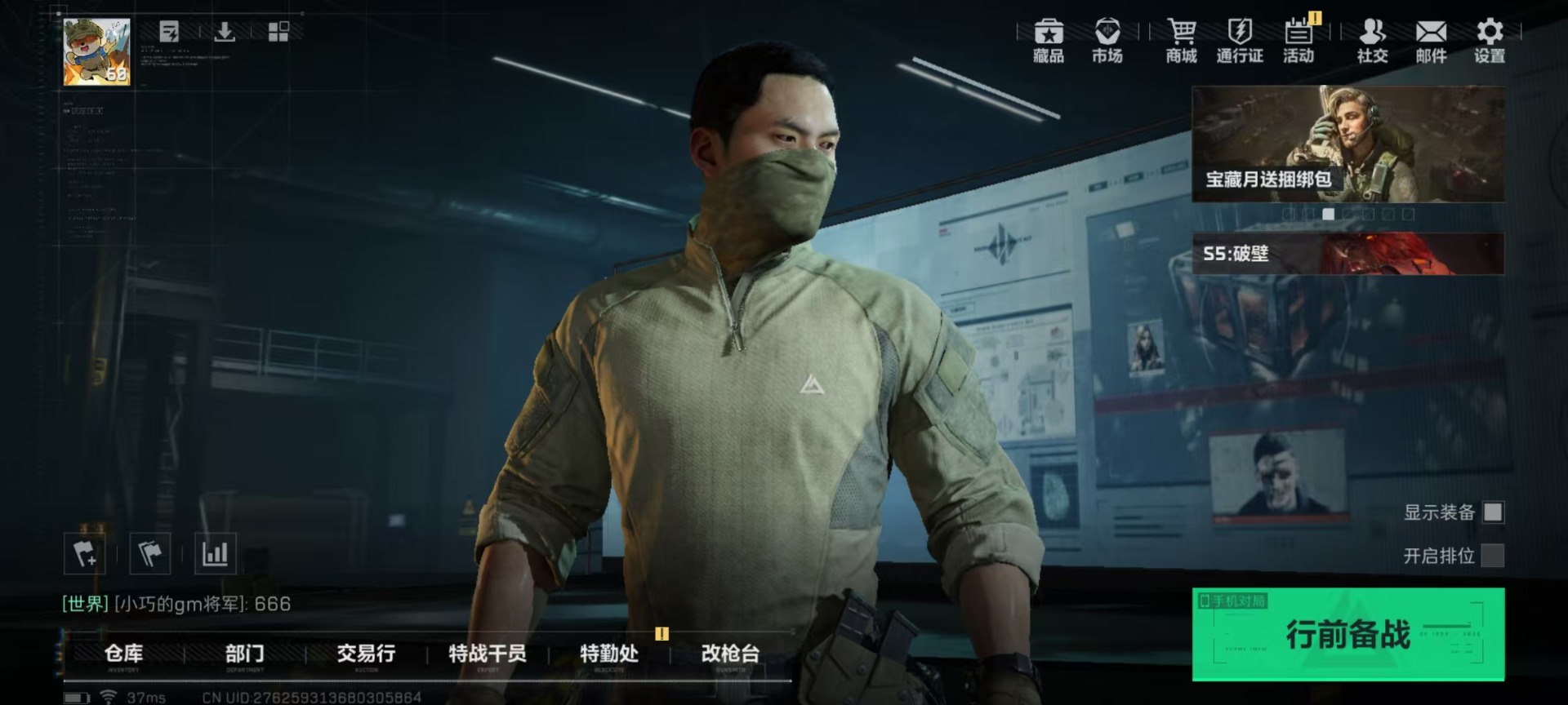 - [11680817]总资产:307.5 2干员外观 1近战传说 13传说枪械 可二次 可修改实名 烽火地带段位:黑鹰 全面战场段位:军士长 哈夫币:4.875 传说武器皮肤:近战-黑海,AS Val突击步枪-蛇年祥瑞,SR-25射手步枪-水墨云图,SCAR-H战斗步枪-铁艺苍穹,AK-12突击步枪-夜鹰,SMG45冲锋枪-骑士,QJB201轻机枪-黑海,MP5冲锋枪-黑海,M7战斗步枪-维京,M4A1突击步枪-蚀金玫瑰,P90冲锋枪-神秘艺术,QBZ95-1突击步枪-破军,M7战斗步枪-神秘艺术 干员外观:红狼-蚀金玫瑰,牧羊人-街头之王