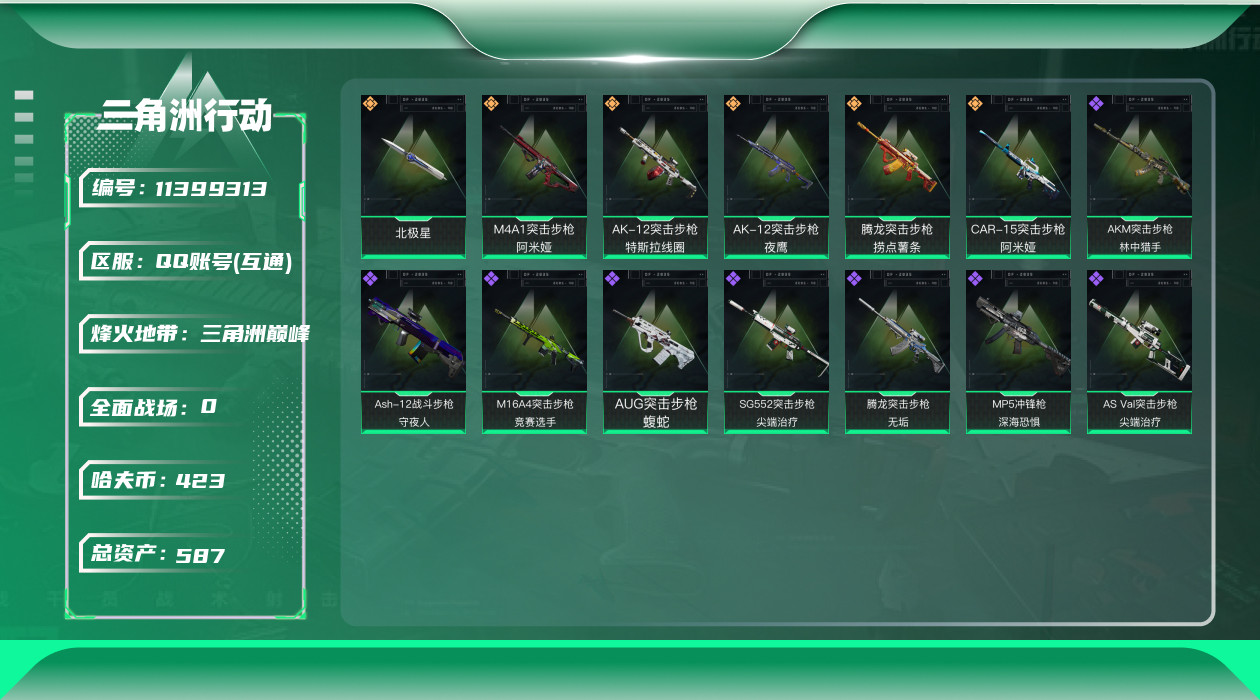 [11399313]总资产:587.8M 1近战传说 6传说枪械 哈夫币:423K 高级安全箱(9.17到期) 可二次 可修改实名 优质装备:近战-北极星 烽火地带段位:三角洲巅峰 全面战场段位:军士长 传说武器皮肤:AK-12突击步枪-夜鹰,腾龙突击步枪-捞点薯条,AK-12突击步枪-特斯拉线圈,CAR-15突击步枪-阿米娅,M4A1突击步枪-阿米娅 史诗武器皮肤:AUG突击步枪-蝮蛇,Ash-12战斗步枪-守夜人,M16A4突击步枪-竞赛选手,AS Val突击步枪-尖端治疗,SG552突击步枪-尖端治疗,MP5冲锋枪-深海恐惧,AKM突击步枪-林中猎手,腾龙突击步枪-无垢