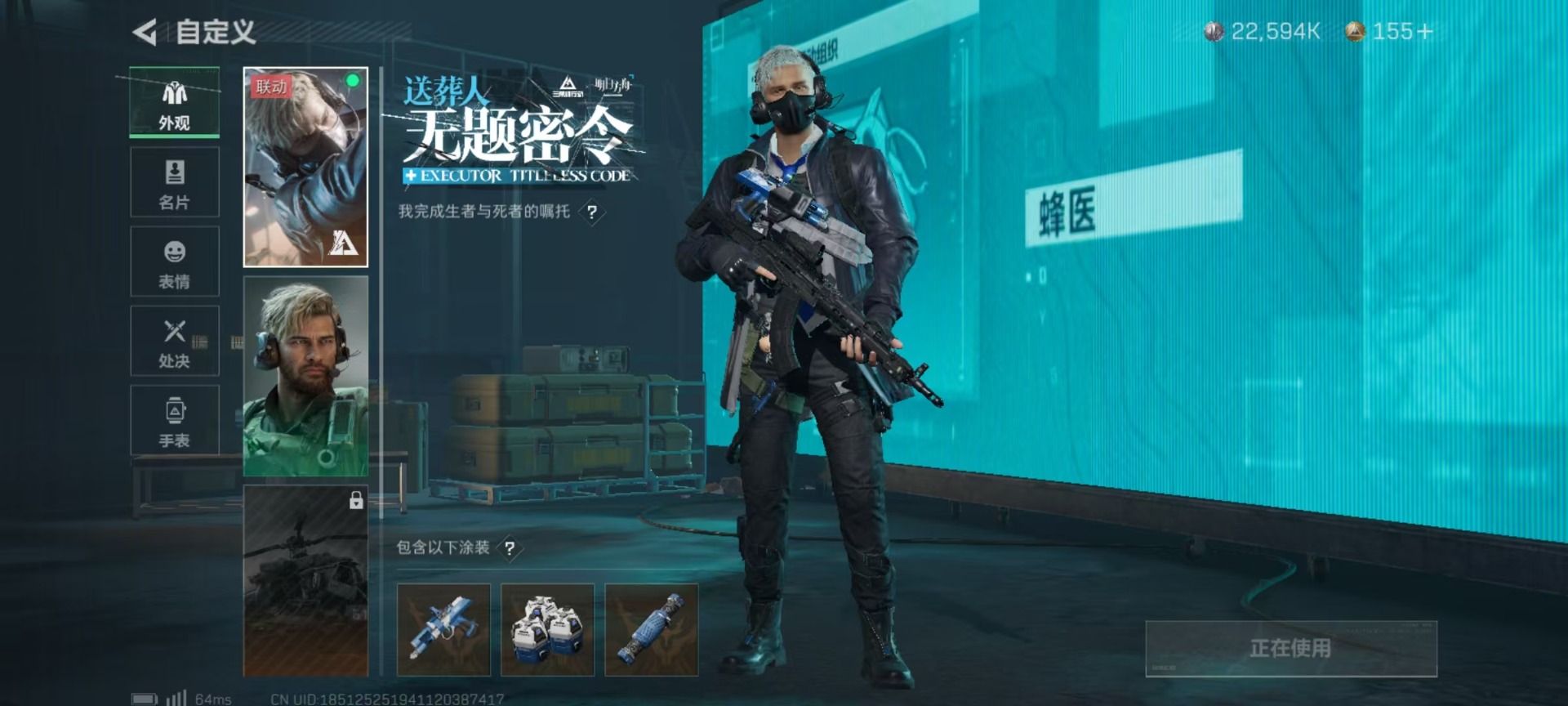 - [12359513]实名: 可修改 时装数: 355 枪械数: 129 战备数: 87 热门装扮: 鹰眼刺客,智耀战神 稀有枪皮: M762-电糖天使,M416电玩时刻,GROZA-镜光银凌,Kar98K-巳巳如意,MK14-甜梦熊击,DP-28-豹影疾电