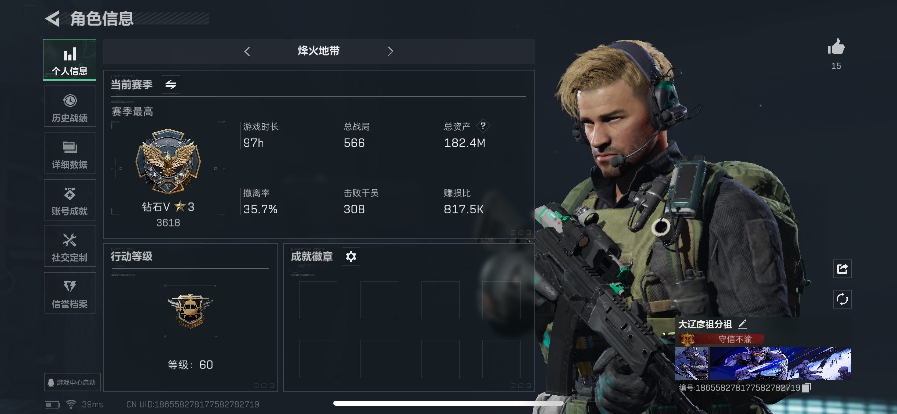 - [11823728]总资产:178.2M 12传说枪械 哈夫币:74.133K 可二次 可修改实名 优质装备:顶级安全箱(3x3) 烽火地带段位:钻石 全面战场段位:无段位 传说武器皮肤:SR-25射手步枪-水墨云图,SMG45冲锋枪-骑士,UZI冲锋枪-特斯拉线圈,AWM狙击步枪-捞点薯条,腾龙突击步枪-捞点薯条,93R-捞点薯条,AK-12突击步枪-特斯拉线圈,SR-3M紧凑突击步枪-特斯拉线圈,Vector冲锋枪-能天使-午夜邮差,复合弓-黑-天际线,M4A1突击步枪-阿米娅,CAR-15突击步枪-阿米娅 史诗武器皮肤:SR-3M紧凑突击步枪-英雄,PKM通用机枪-蝮蛇,AUG突击步枪-蝮蛇,M700狙击步枪-蝮蛇,G3战斗步枪-战场英杰,QJB201轻机枪-Old Habits,M1014霰弹枪-林中猎手,MP5冲锋枪-深海恐惧,勇士冲锋枪-深海恐惧,SG552突击步枪-深海恐惧,AKM突击步枪-林中猎手,M16A4突击步枪-竞赛选手,M250通用机枪-囚徒,SV-98狙击步枪-林中猎手,SV-98狙击步枪-囚徒,SCAR-H战斗步枪-囚徒,QBZ95-1突击步枪-曙光,沙漠之鹰-曙光,Vector冲锋枪-阿萨拉文明,SVD狙击步枪-阿萨拉工艺,S12K霰弹枪-曙光,M700狙击步枪-竞技风,QSZ92G-风林火山,93R-博士
