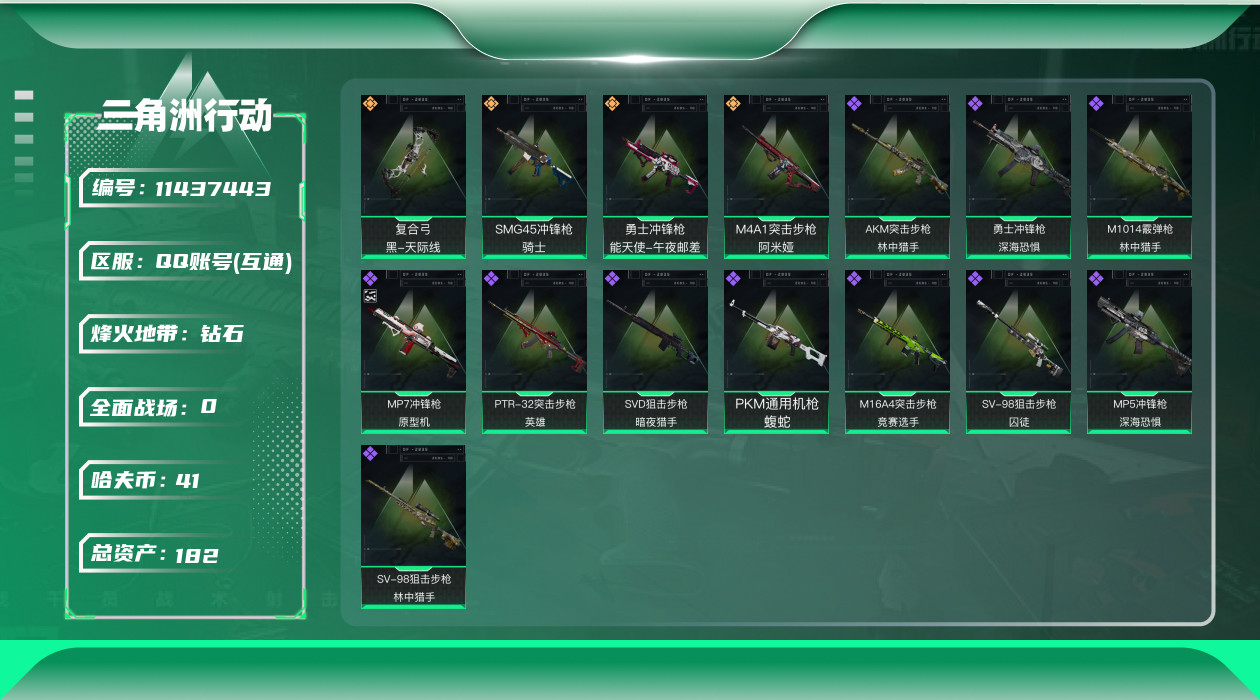 [11437443]总资产:182.4M 4传说枪械 哈夫币:41.638K 可二次 可修改实名 优质装备:顶级安全箱(3x3) 烽火地带段位:钻石 全面战场段位:校官 传说武器皮肤:SMG45冲锋枪-骑士,勇士冲锋枪-能天使-午夜邮差,复合弓-黑-天际线,M4A1突击步枪-阿米娅 史诗武器皮肤:MP7冲锋枪-原型机(典藏),PKM通用机枪-蝮蛇,SVD狙击步枪-暗夜猎手,M16A4突击步枪-竞赛选手,MP5冲锋枪-深海恐惧,勇士冲锋枪-深海恐惧,AKM突击步枪-林中猎手,M1014霰弹枪-林中猎手,SV-98狙击步枪-林中猎手,PTR-32突击步枪-英雄,SV-98狙击步枪-囚徒