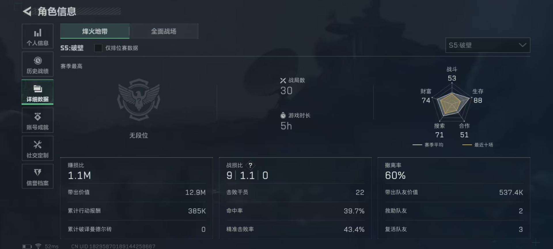 [11445452]总资产:70.1M 哈夫币:2.452K 可二次 可修改实名 烽火地带段位:无段位 全面战场段位:无段位 史诗武器皮肤:AKM突击步枪-林中猎手,M1014霰弹枪-林中猎手