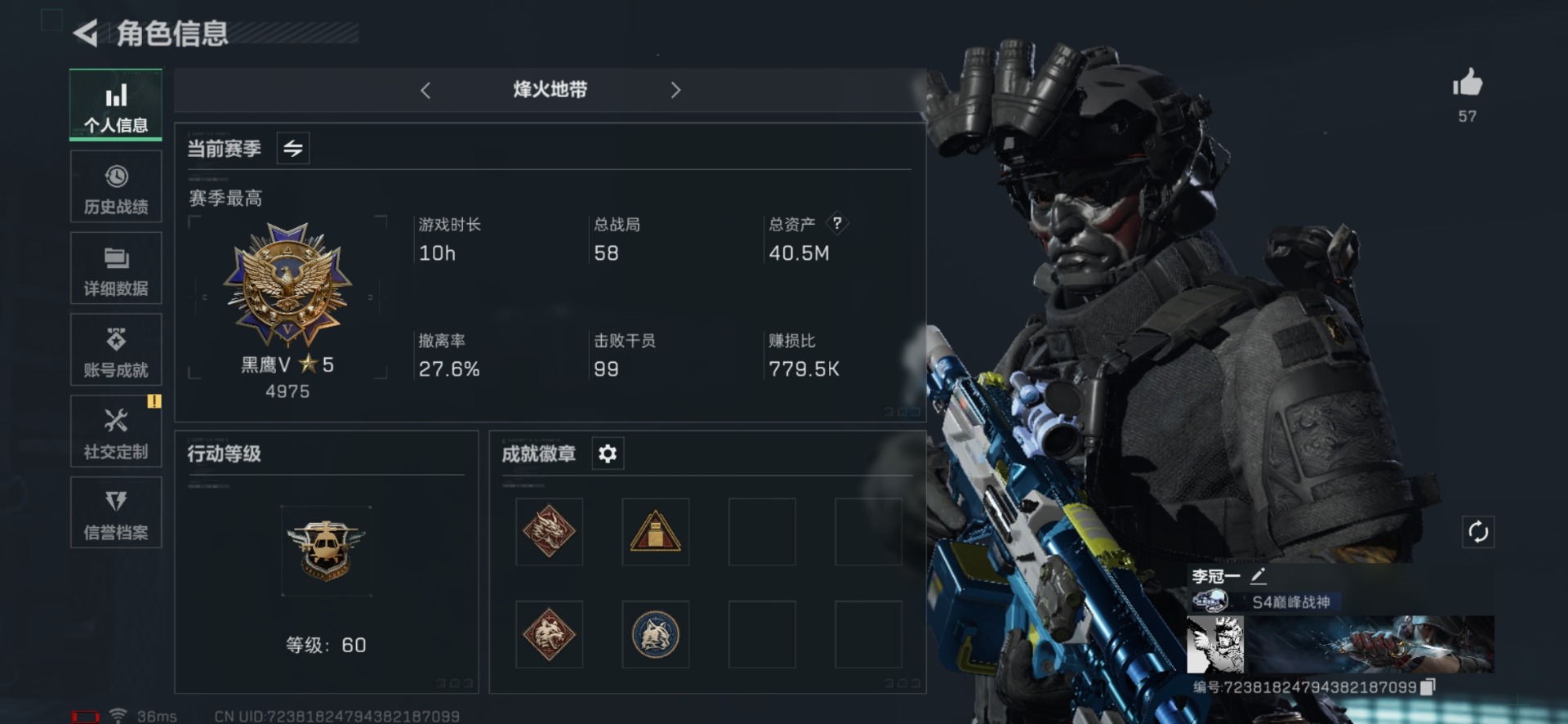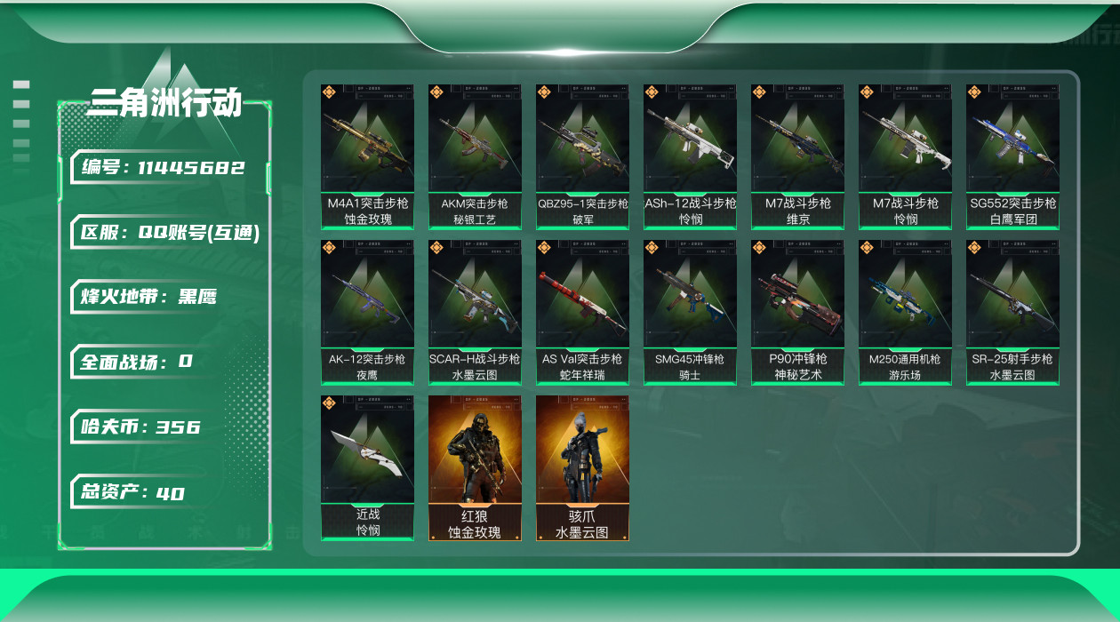 [11445682]总资产:40.5 2干员外观 1近战传说 15传说枪械 段位:无段位 可二次 可修改实名 烽火地带段位:黑鹰 全面战场段位:无段位 哈夫币:356 传说武器皮肤:近战-怜悯,AS Val突击步枪-蛇年祥瑞,SCAR-H战斗步枪-水墨云图,SR-25射手步枪-水墨云图,AK-12突击步枪-夜鹰,SMG45冲锋枪-骑士,AKM突击步枪-秘银工艺,M250通用机枪-游乐场,M7战斗步枪-维京,M7战斗步枪-怜悯,ASh-12战斗步枪-怜悯,SG552突击步枪-白鹰军团,M4A1突击步枪-蚀金玫瑰,P90冲锋枪-神秘艺术,QBZ95-1突击步枪-破军 干员外观:红狼-蚀金玫瑰,骇爪-水墨云图
