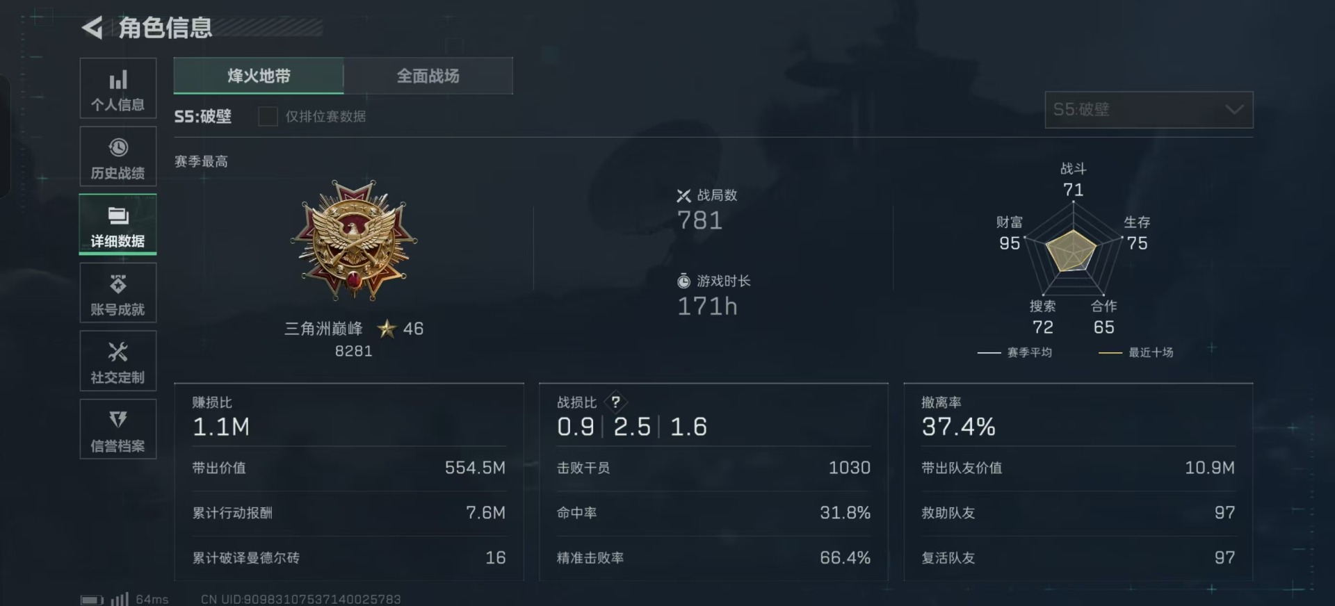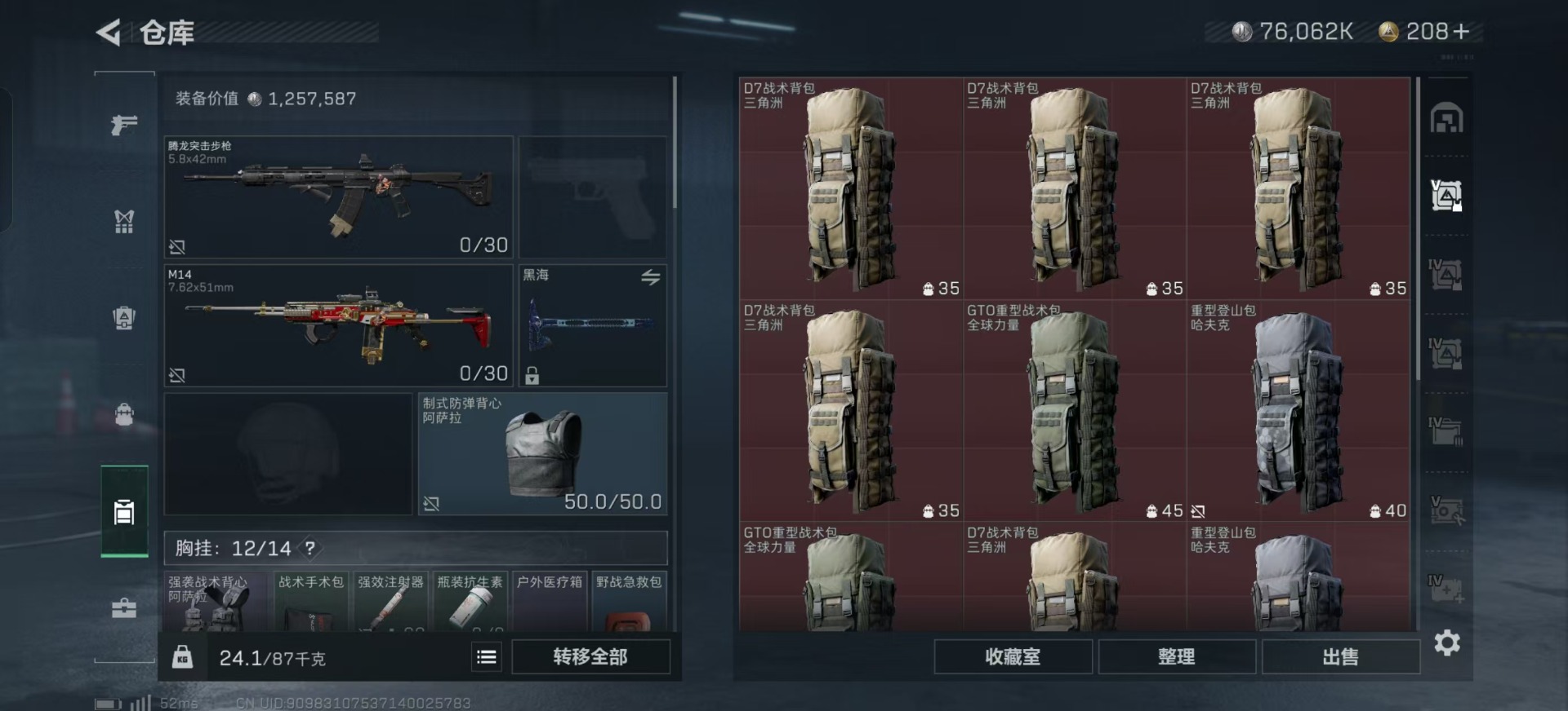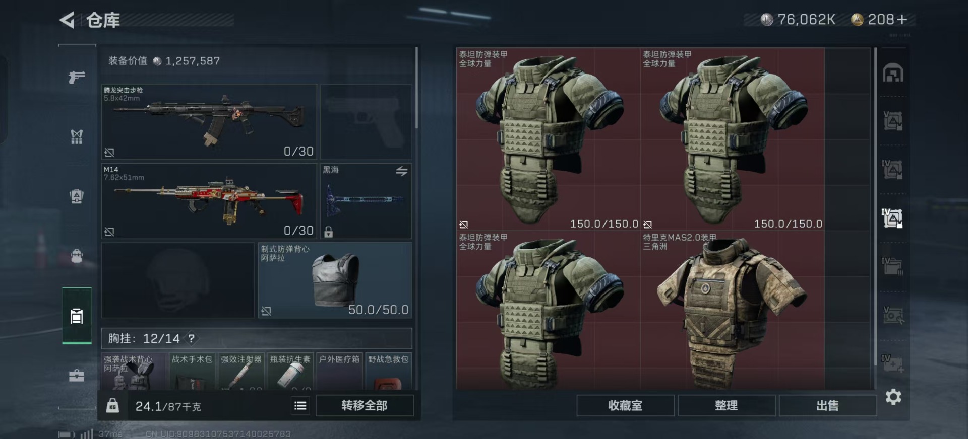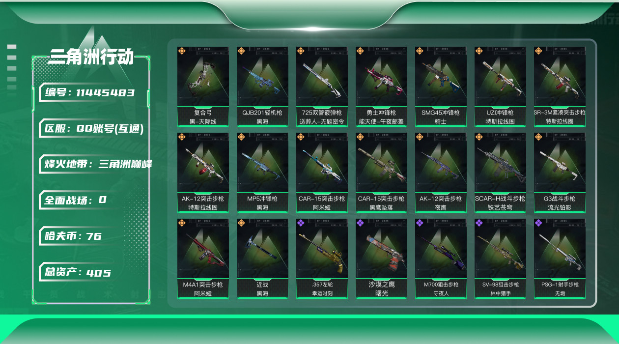 [11445483]总资产:405.8M 3干员外观 1近战传说 16传说枪械 哈夫币:76.062K 顶级安全箱(3×3)9.15号到期 可二次 可修改实名 优质装备:近战-黑海,顶级安全箱(3x3) 烽火地带段位:三角洲巅峰 全面战场段位:无段位 传说武器皮肤:SCAR-H战斗步枪-铁艺苍穹,AK-12突击步枪-夜鹰,SMG45冲锋枪-骑士,G3战斗步枪-流光铂影,M4A1突击步枪-阿米娅,CAR-15突击步枪-阿米娅,复合弓-黑-天际线,AK-12突击步枪-特斯拉线圈,SR-3M紧凑突击步枪-特斯拉线圈,UZI冲锋枪-特斯拉线圈,勇士冲锋枪-能天使-午夜邮差,725双管霰弹枪-送葬人-无题密令,MP5冲锋枪-黑海,QJB201轻机枪-黑海,CAR-15突击步枪-黑鹰坠落 史诗武器皮肤:QBZ95-1突击步枪-ACE,M4A1突击步枪-特勤执行,AUG突击步枪-特勤执行,Vector冲锋枪-红色彗星,PTR-32战斗步枪-ACE,SKS射手步枪-ACE,PKM通用机枪-蝮蛇,G3战斗步枪-战场英杰,Ash-12战斗步枪-守夜人,M16A4突击步枪-竞赛选手,PKM通用机枪-守夜人,AS Val突击步枪-尖端治疗,M700狙击步枪-守夜人,SG552突击步枪-尖端治疗,SR-25射手步枪-尖端治疗,PKM通用机枪-荒野求生,勇士冲锋枪-深海恐惧,SG552突击步枪-深海恐惧,AKM突击步枪-林中猎手,.357左轮-幸运时刻,SR-3M紧凑突击步枪-荒野求生,M1014霰弹枪-林中猎手,QCQ171冲锋枪-禁卫,SV-98狙击步枪-林中猎手,PTR-32突击步枪-英雄,SVD狙击步枪-荒野求生,AS Val突击步枪-典狱官,M250通用机枪-囚徒,SCAR-H战斗步枪-囚徒,腾龙突击步枪-无垢,MP7冲锋枪-无垢,PSG-1射手步枪-无垢,M14射手步枪-黑鹰坠落,M14射手步枪-禁卫,QBZ95-1突击步枪-曙光,沙漠之鹰-曙光,SVD狙击步枪-阿萨拉工艺,S12K霰弹枪-曙光,M7战斗步枪-禁卫,PKM通用机枪-英雄,AUG突击步枪-战术迷彩 干员外观:威龙-壮志凌云,无名-夜鹰,露娜-黑·天际线