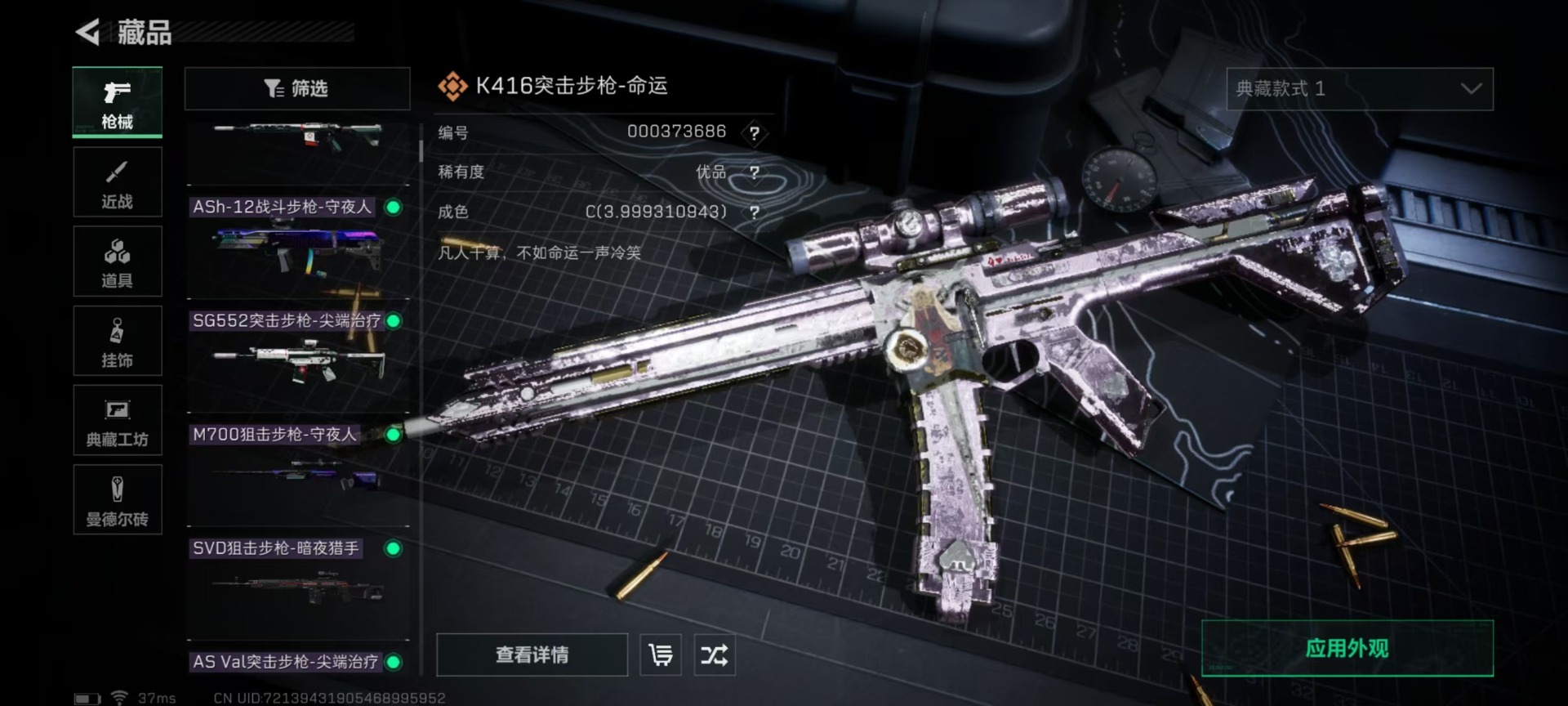 - [12038111]【暑期末清货/特价急出/永久包赔】:安卓 手Q-1粉装-1特效枪-0载具-5707热力值-0印记-20套装-13枪皮【特效枪等级】:Kar98K-巳巳如意(一级)【优质套装】:粉装-深海曼妙