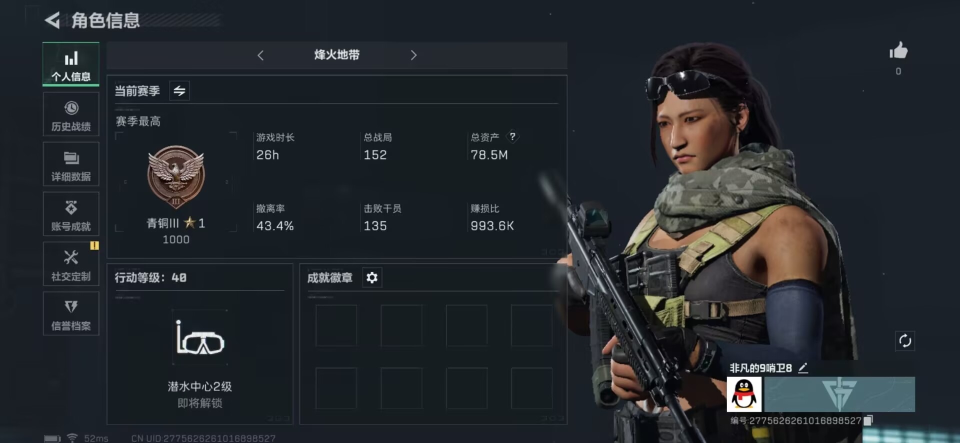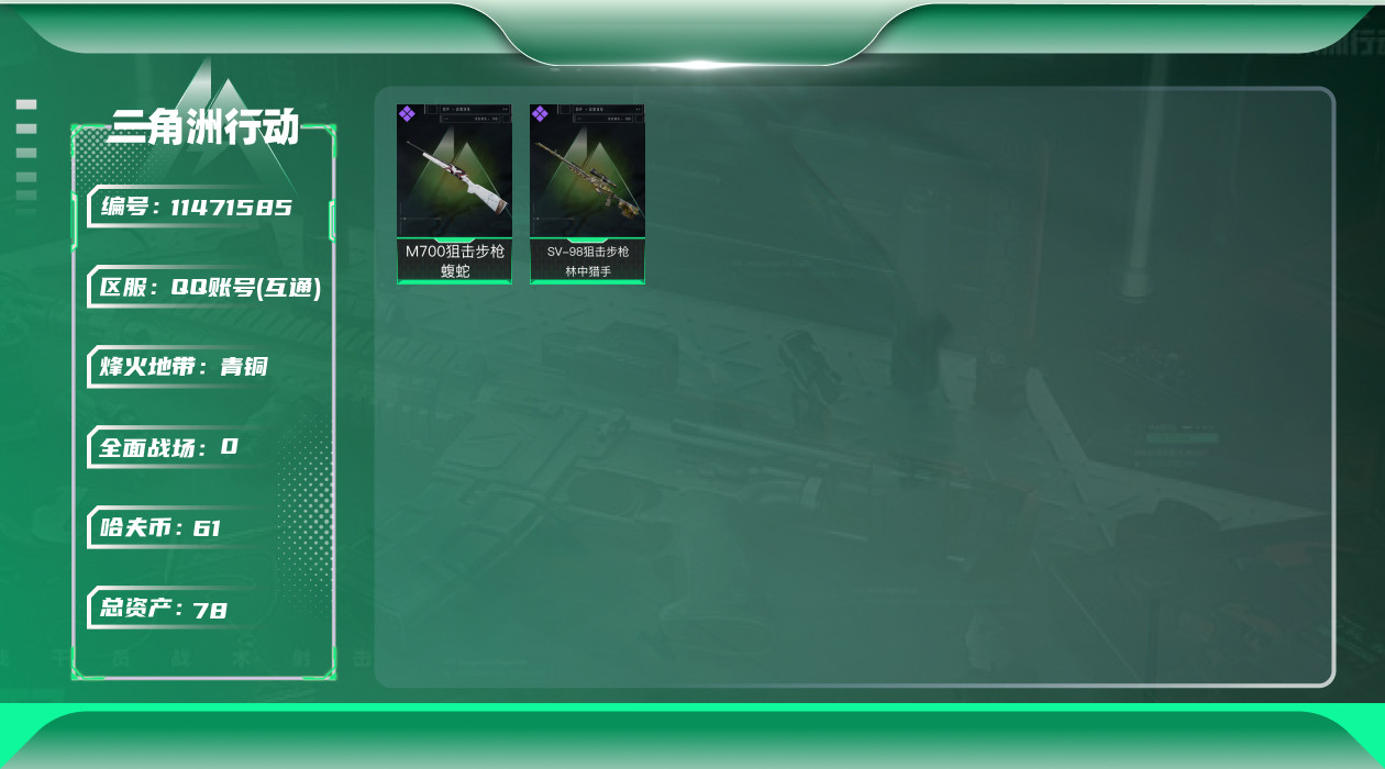 [11471585]总资产:78.5 可二次 可修改实名 烽火地带段位:青铜 全面战场段位:无段位 哈夫币:61.837 史诗武器皮肤:M700狙击步枪-蝮蛇,SV-98狙击步枪-林中猎手