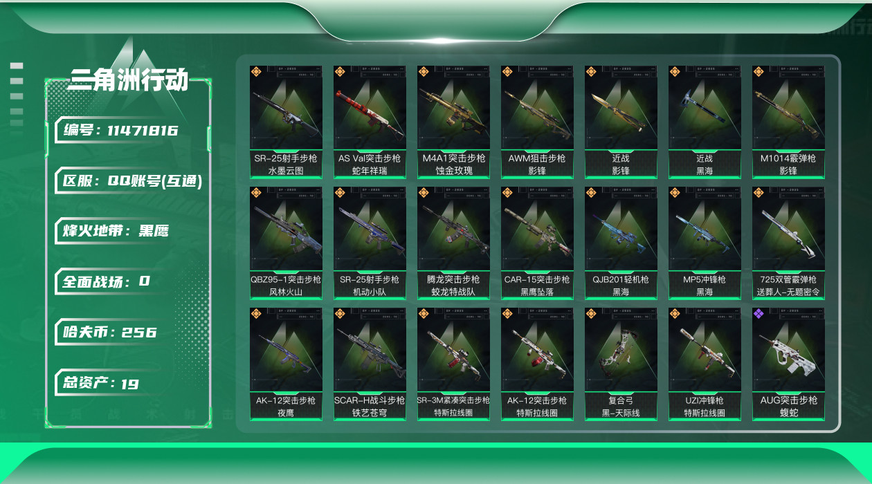 [11471816]总资产:19.6 1干员外观 2近战传说 20传说枪械 高级安全箱(2×3)9.15号到期 可二次 可修改实名 优质装备:近战-影锋,近战-黑海 烽火地带段位:黑鹰 全面战场段位:军士长 哈夫币:256.139 传说武器皮肤:QBZ95-1突击步枪-风林火山,腾龙突击步枪-蛟龙特战队,AS Val突击步枪-蛇年祥瑞,SR-25射手步枪-水墨云图,AWM狙击步枪-影锋,M1014霰弹枪-影锋,SCAR-H战斗步枪-铁艺苍穹,AK-12突击步枪-夜鹰,SR-3M紧凑突击步枪-特斯拉线圈,AK-12突击步枪-特斯拉线圈,复合弓-黑-天际线,725双管霰弹枪-送葬人-无题密令,QJB201轻机枪-黑海,MP5冲锋枪-黑海,M4A1突击步枪-蚀金玫瑰,CAR-15突击步枪-黑鹰坠落,M7战斗步枪-机动小队,UZI冲锋枪-特斯拉线圈 史诗武器皮肤:M14射手步枪-甜心子弹,SR-3M紧凑突击步枪-英雄,QBZ95-1突击步枪-ACE,M4A1突击步枪-特勤执行,AUG突击步枪-特勤执行,Vector冲锋枪-红色彗星,PTR-32战斗步枪-ACE,SKS射手步枪-ACE,AUG突击步枪-蝮蛇,M700狙击步枪-蝮蛇,PKM通用机枪-蝮蛇,G3战斗步枪-战场英杰,SR-25射手步枪-尖端治疗,PKM通用机枪-荒野求生,AS Val突击步枪-尖端治疗,M700狙击步枪-守夜人,SG552突击步枪-尖端治疗,Ash-12战斗步枪-守夜人,SR-3M紧凑突击步枪-荒野求生,SG552突击步枪-深海恐惧,AKM突击步枪-林中猎手,M16A4突击步枪-竞赛选手,PKM通用机枪-守夜人,SVD狙击步枪-荒野求生,M1014霰弹枪-林中猎手,SV-98狙击步枪-林中猎手,PTR-32突击步枪-英雄,PSG-1射手步枪-无垢,SCAR-H战斗步枪-囚徒,腾龙突击步枪-无垢,MP7冲锋枪-无垢,QBZ95-1突击步枪-曙光,SVD狙击步枪-阿萨拉工艺,S12K霰弹枪-曙光,M14射手步枪-黑鹰坠落,M700狙击步枪-竞技风,QSZ92G-风林火山 干员外观:红狼-蚀金玫瑰