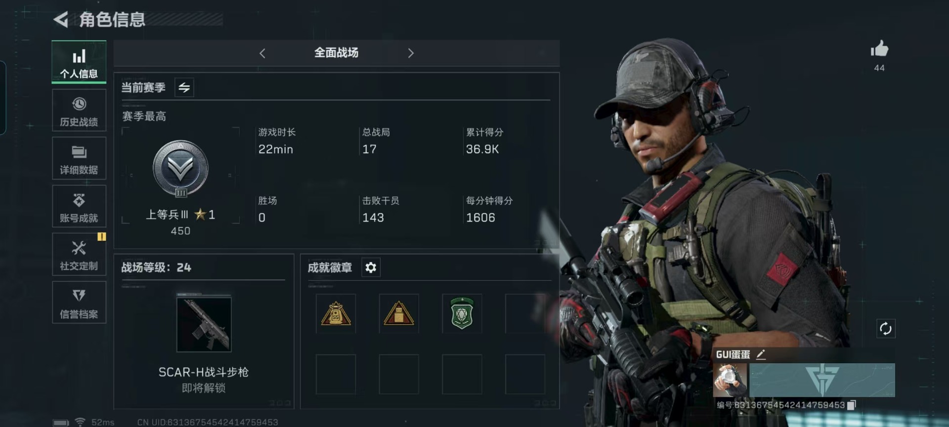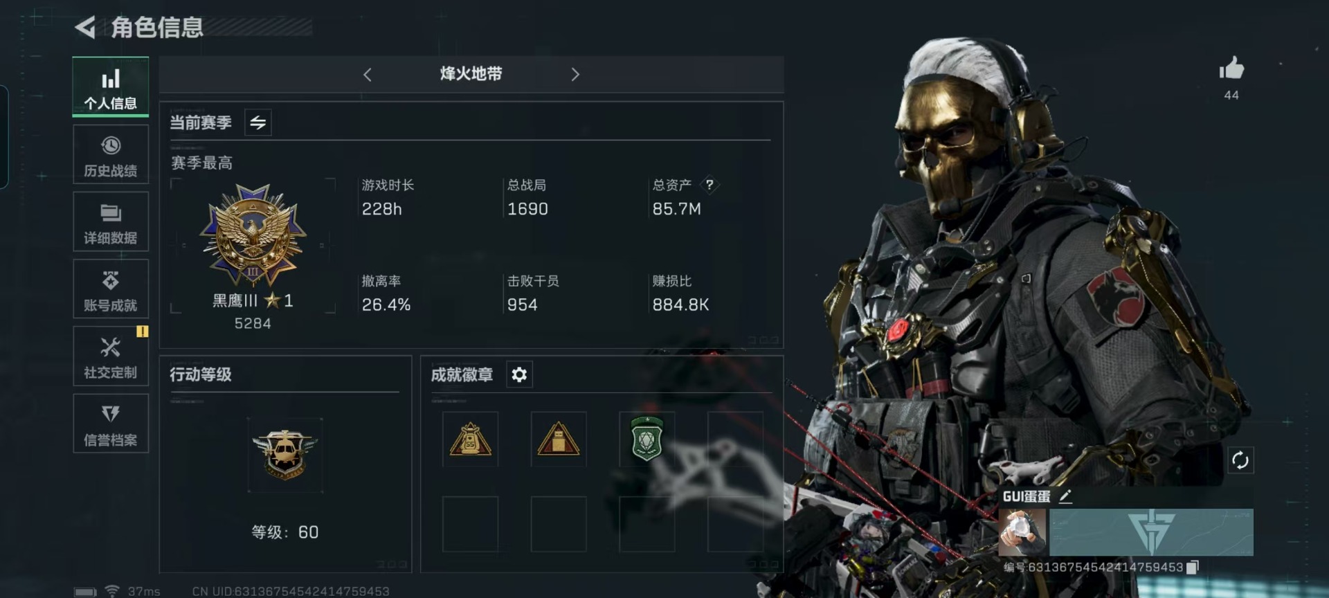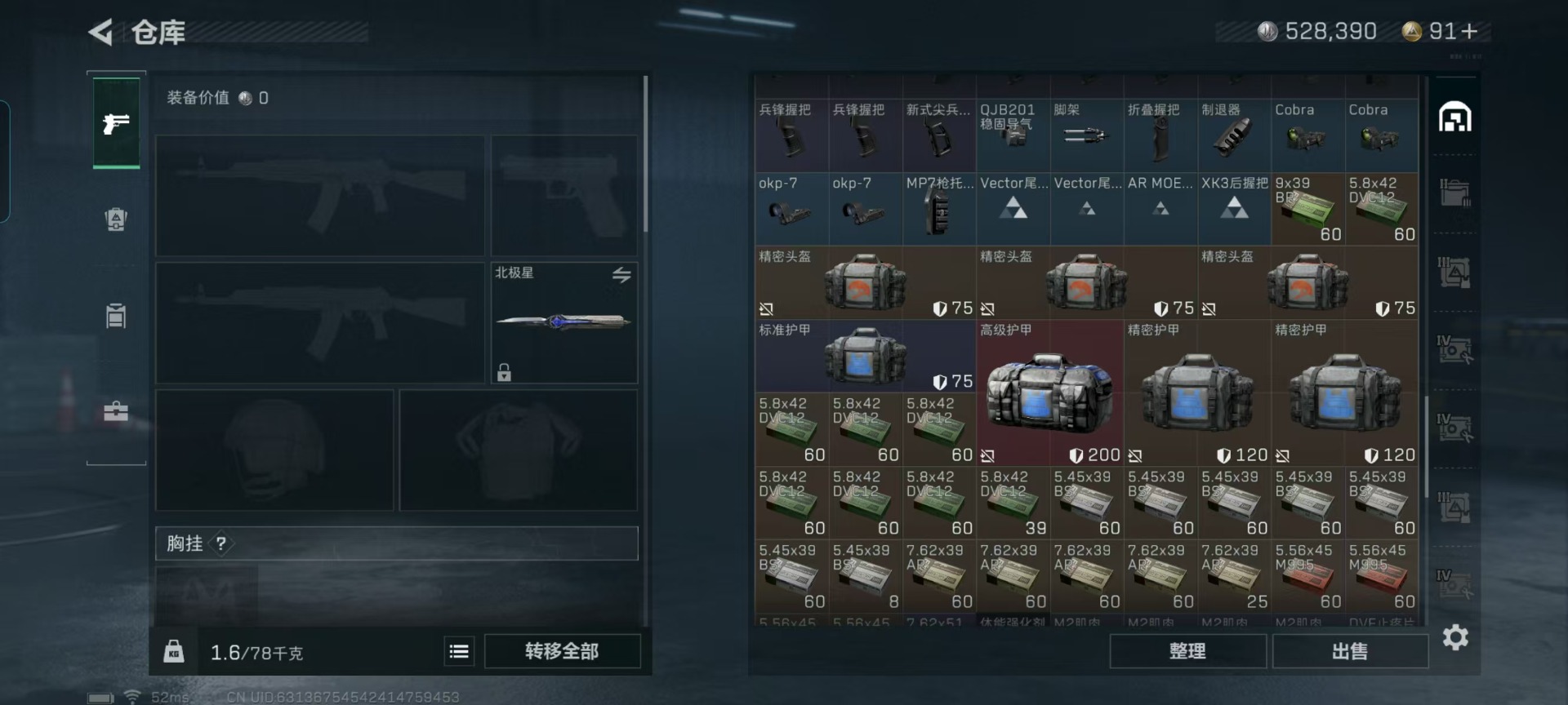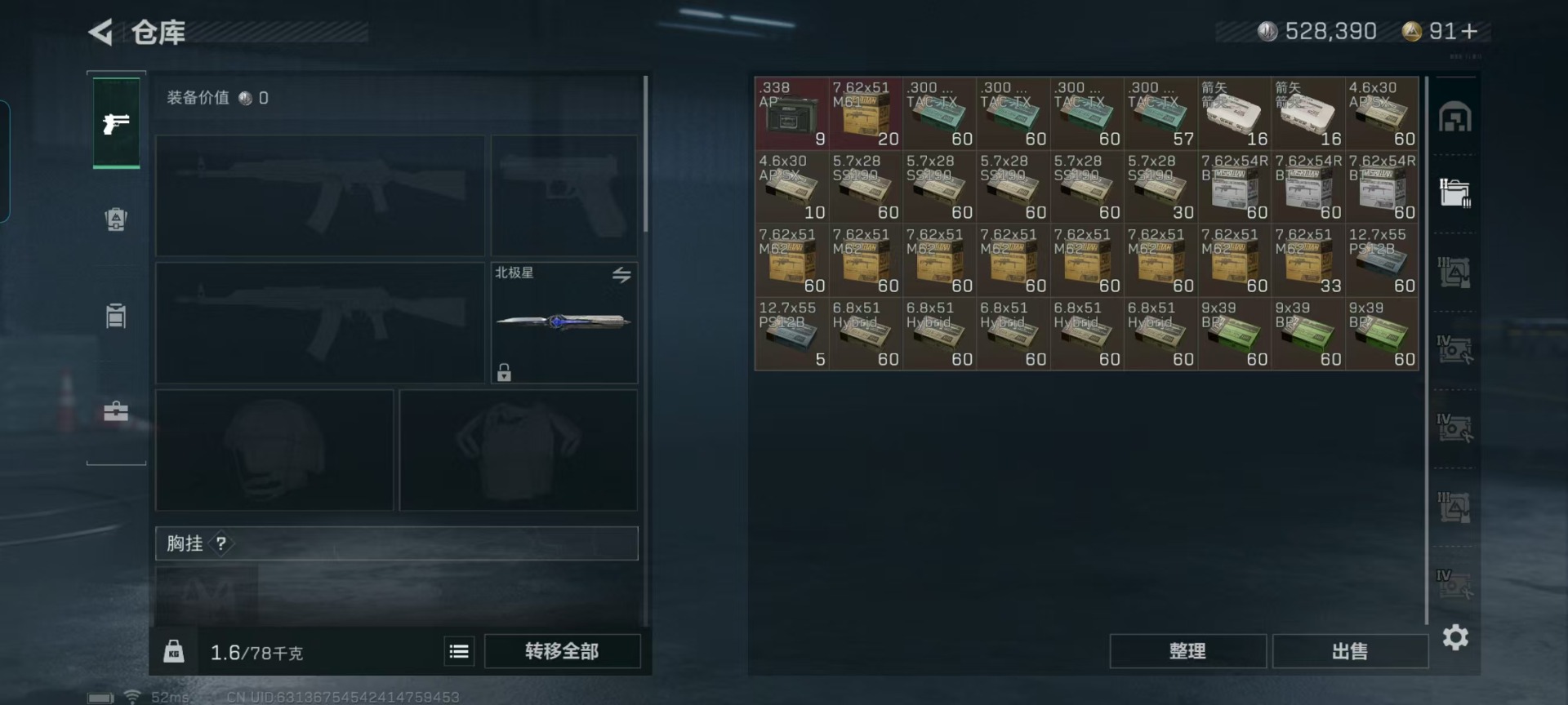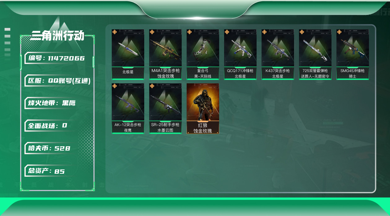 [11472066]总资产:85.7 1干员外观 1近战传说 9传说枪械 顶级安全箱(9.17到期) 可二次 可修改实名 烽火地带段位:黑鹰 全面战场段位:上等兵 哈夫币:528.390 传说武器皮肤:近战-北极星,SR-25射手步枪-水墨云图,AK-12突击步枪-夜鹰,SMG45冲锋枪-骑士,复合弓-黑-天际线,725双管霰弹枪-送葬人-无题密令,QCQ171冲锋枪-北极星,K437突击步枪-北极星,M4A1突击步枪-蚀金玫瑰 干员外观:红狼-蚀金玫瑰