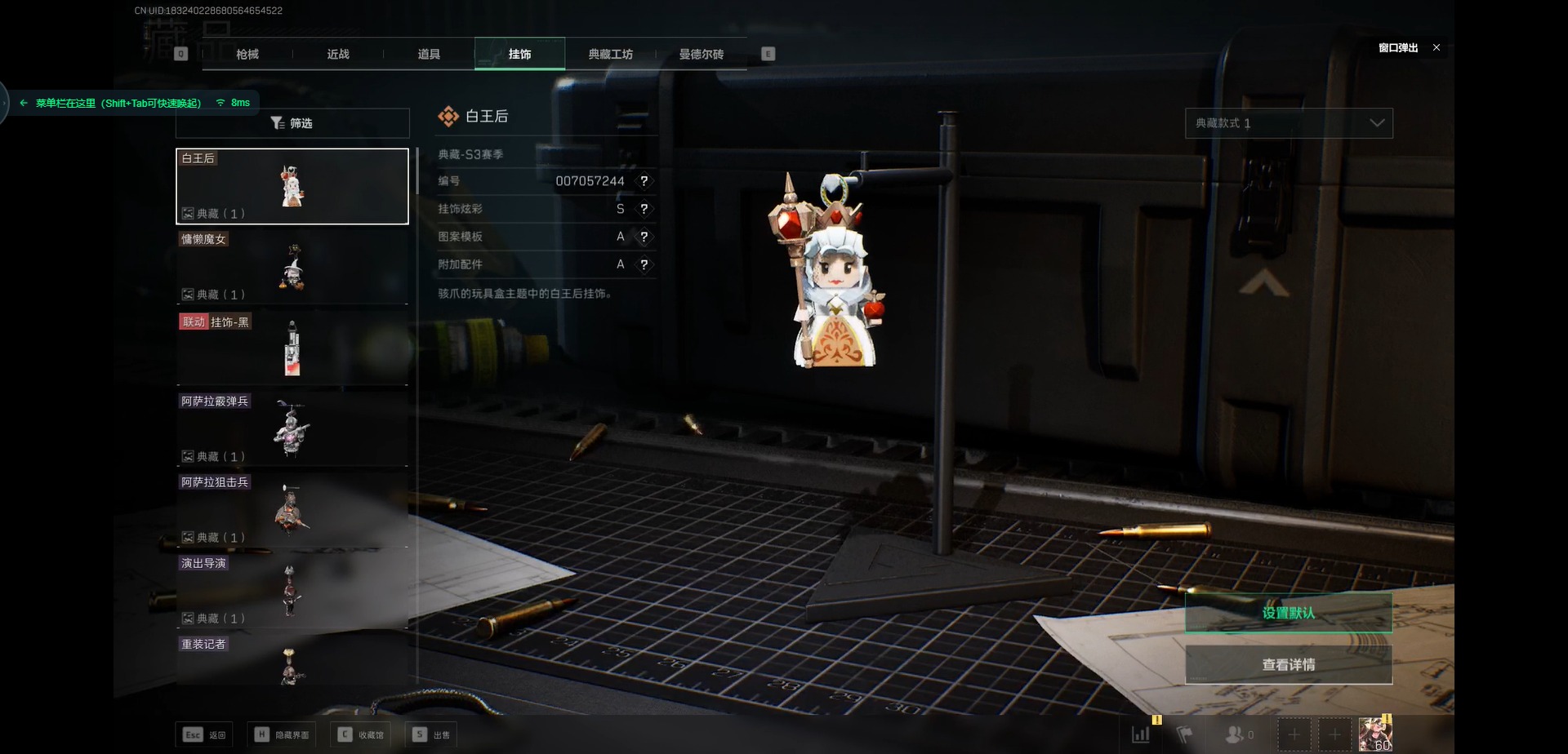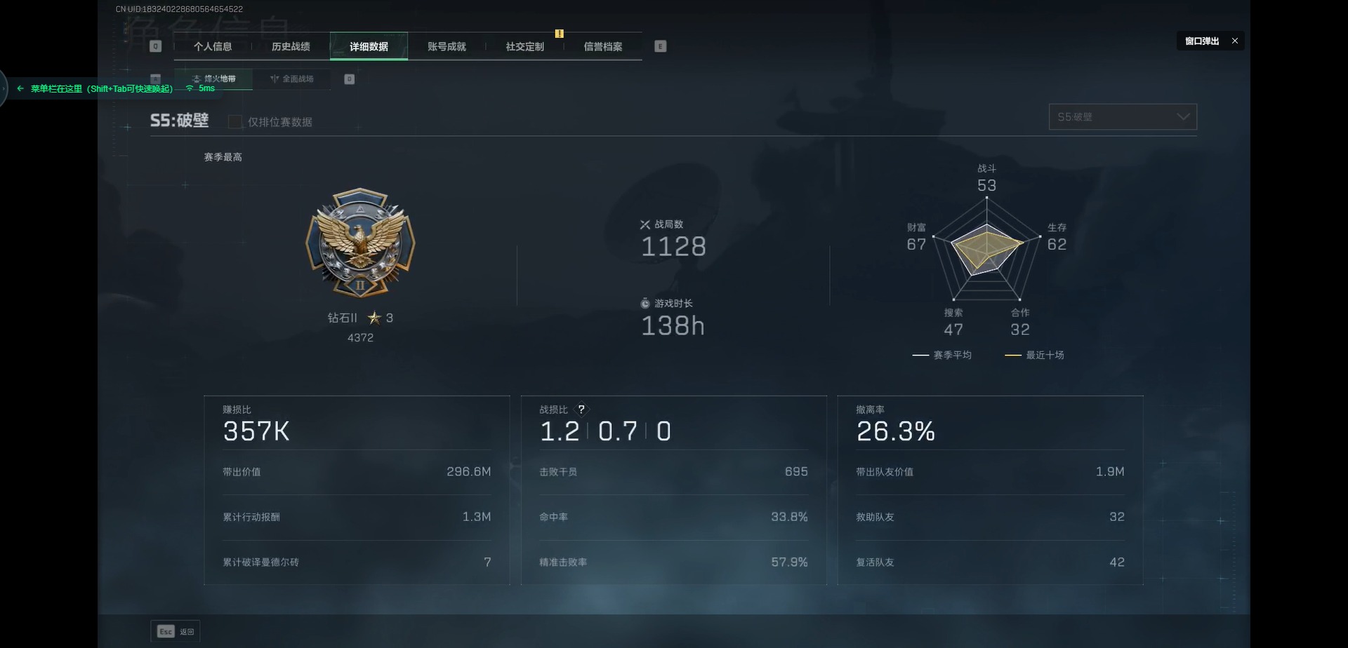 - [11603190]总资产:83.4M 5干员外观 1近战传说 13传说枪械 哈夫币:9.363K 可二次 可修改实名 优质装备:近战-影锋 烽火地带段位:铂金 全面战场段位:上等兵 传说武器皮肤:AS Val突击步枪-蛇年祥瑞,SR-25射手步枪-水墨云图,SCAR-H战斗步枪-水墨云图,M1014霰弹枪-影锋,SCAR-H战斗步枪-铁艺苍穹,AK-12突击步枪-夜鹰,G18-飞虎,SMG45冲锋枪-骑士,勇士冲锋枪-能天使-午夜邮差,M4A1突击步枪-蚀金玫瑰,QBZ95-1突击步枪-破军,Vector冲锋枪-能天使-午夜邮差 史诗武器皮肤:SR-3M紧凑突击步枪-英雄,QBZ95-1突击步枪-ACE,M4A1突击步枪-特勤执行,M700狙击步枪-蝮蛇,PKM通用机枪-蝮蛇,Ash-12战斗步枪-守夜人,SG552突击步枪-尖端治疗,SR-25射手步枪-尖端治疗,SG552突击步枪-深海恐惧,AKM突击步枪-林中猎手,M1014霰弹枪-林中猎手,SV-98狙击步枪-林中猎手,M250通用机枪-囚徒,SV-98狙击步枪-囚徒,M700狙击步枪-阿萨拉工艺,UZI冲锋枪-危险实验,M249轻机枪-维京,沙漠之鹰-曙光,Vector冲锋枪-阿萨拉文明,S12K霰弹枪-曙光,PKM通用机枪-英雄,M700狙击步枪-竞技风,QSZ92G-风林火山,93R-博士,ASh-12战斗步枪-刀锋 干员外观:威龙-铁面判官,红狼-蚀金玫瑰,骇爪-水墨云图,无名-夜鹰,威龙-飞虎