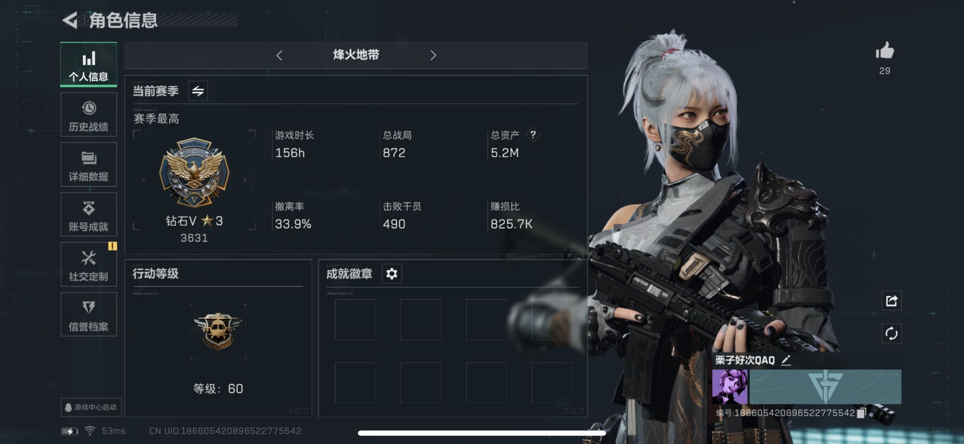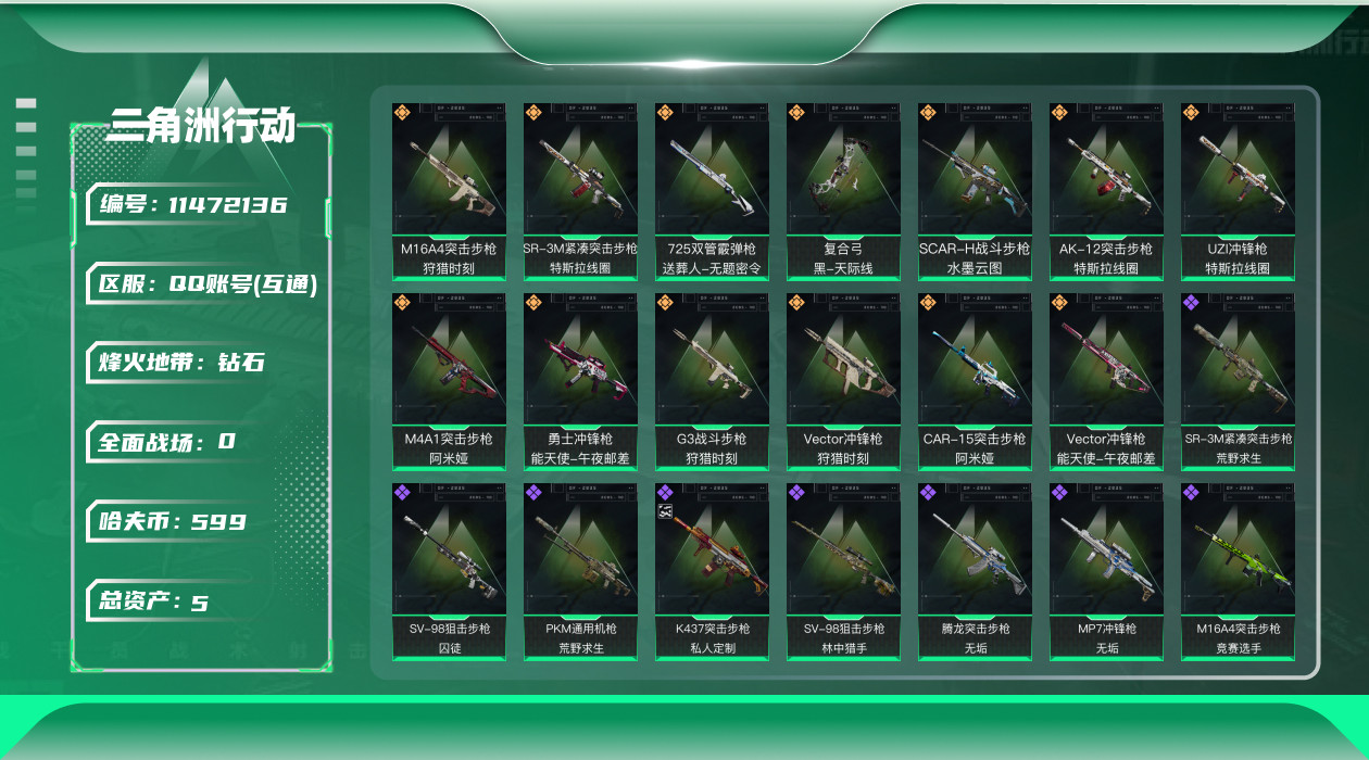 [11472136]总资产:5.2M 3干员外观 13传说枪械 哈夫币:599.957K 高级安全箱(2×3)9.15号到期 可二次 可修改实名 烽火地带段位:钻石 全面战场段位:上等兵 传说武器皮肤:SCAR-H战斗步枪-水墨云图,UZI冲锋枪-特斯拉线圈,M16A4突击步枪-狩猎时刻,AK-12突击步枪-特斯拉线圈,SR-3M紧凑突击步枪-特斯拉线圈,勇士冲锋枪-能天使-午夜邮差,Vector冲锋枪-狩猎时刻,Vector冲锋枪-能天使-午夜邮差,G3战斗步枪-狩猎时刻,复合弓-黑-天际线,725双管霰弹枪-送葬人-无题密令,M4A1突击步枪-阿米娅,CAR-15突击步枪-阿米娅 史诗武器皮肤:K437突击步枪-私人定制(典藏),M700狙击步枪-蝮蛇,PKM通用机枪-蝮蛇,M16A4突击步枪-竞赛选手,SV-98狙击步枪-林中猎手,PKM通用机枪-荒野求生,M250通用机枪-囚徒,SV-98狙击步枪-囚徒,腾龙突击步枪-无垢,MP7冲锋枪-无垢,PSG-1射手步枪-无垢,SVD狙击步枪-荒野求生,SR-3M紧凑突击步枪-荒野求生,QBZ95-1突击步枪-曙光 干员外观:骇爪-水墨云图,蜂医-送葬人·无题密令(S5),露娜-黑·天际线