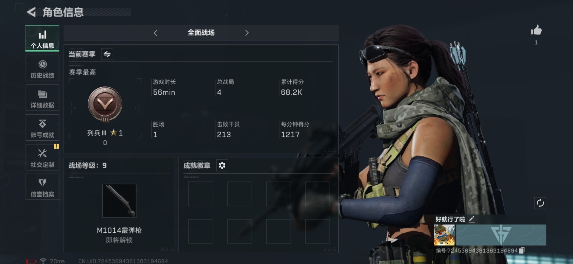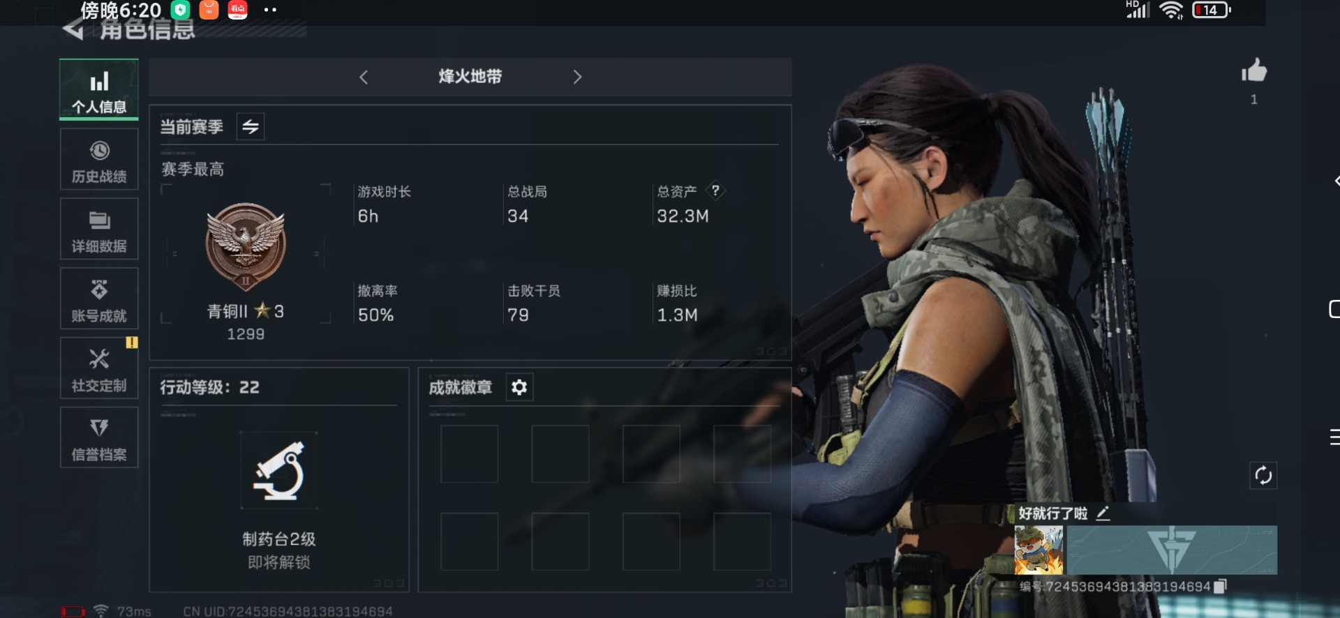 [11446397]总资产:32.3M 5传说枪械 哈夫币:26.369K 可二次 可修改实名 烽火地带段位:青铜 全面战场段位:列兵 传说武器皮肤:M16A4突击步枪-狩猎时刻,Vector冲锋枪-狩猎时刻,G3战斗步枪-狩猎时刻,勇士冲锋枪-能天使-午夜邮差,Vector冲锋枪-能天使-午夜邮差
