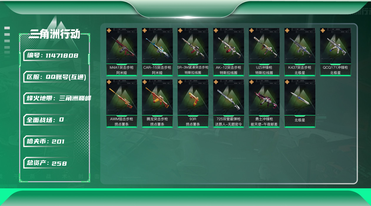 [11471808]总资产:258.9M 1近战传说 13传说枪械 哈夫币:201K 高级安全箱(2×3)9.15号到期 可二次 可修改实名 优质装备:近战-北极星 烽火地带段位:三角洲巅峰 全面战场段位:无段位 传说武器皮肤:M4A1突击步枪-阿米娅,CAR-15突击步枪-阿米娅,AWM狙击步枪-捞点薯条,QCQ171冲锋枪-北极星,腾龙突击步枪-捞点薯条,93R-捞点薯条,AK-12突击步枪-特斯拉线圈,SR-3M紧凑突击步枪-特斯拉线圈,UZI冲锋枪-特斯拉线圈,勇士冲锋枪-能天使-午夜邮差,725双管霰弹枪-送葬人-无题密令,K437突击步枪-北极星