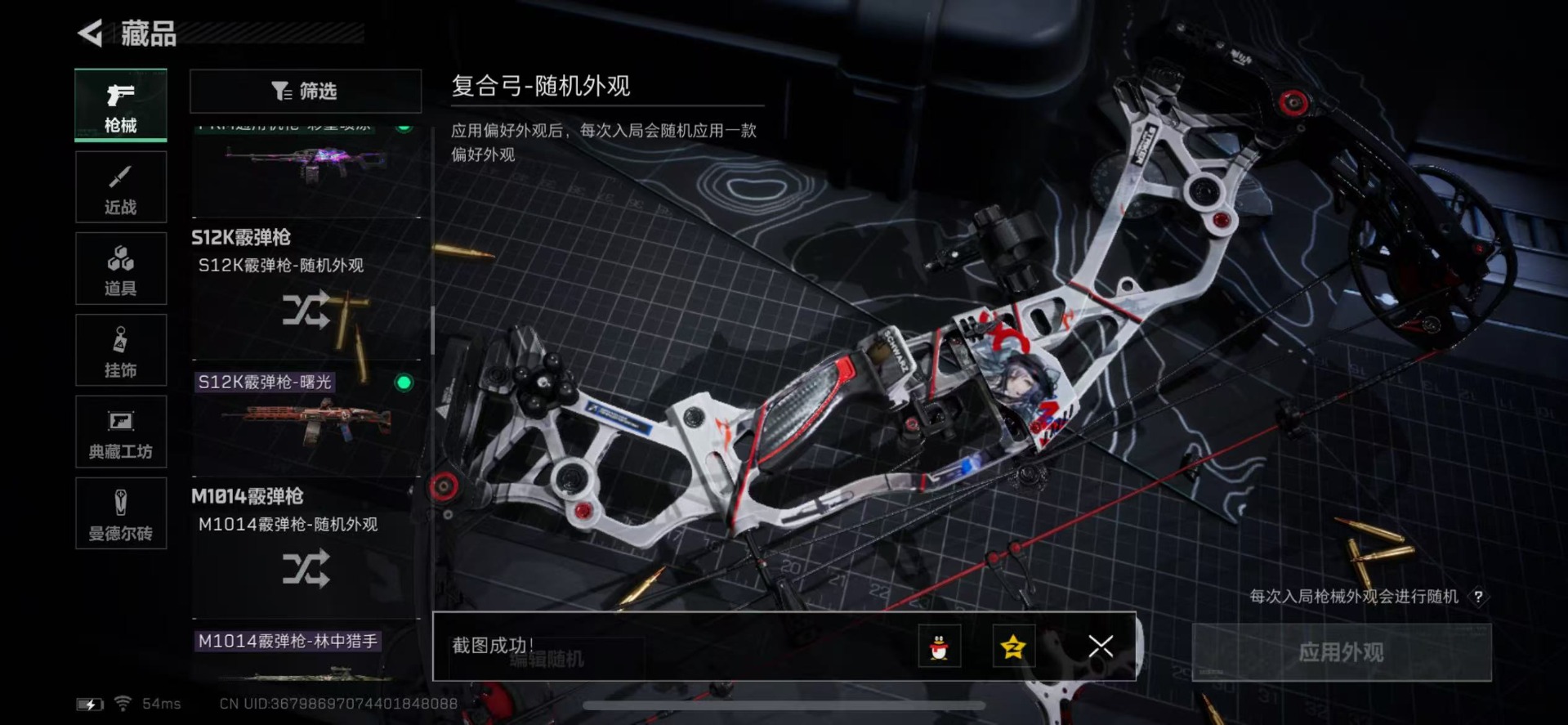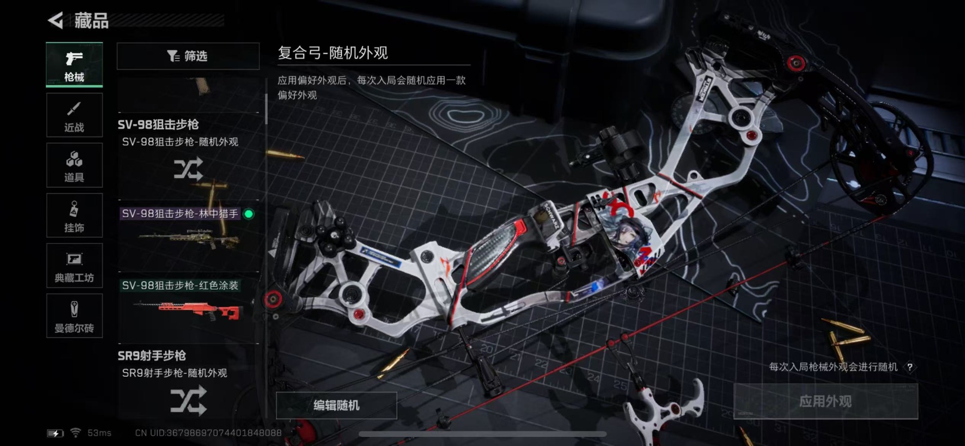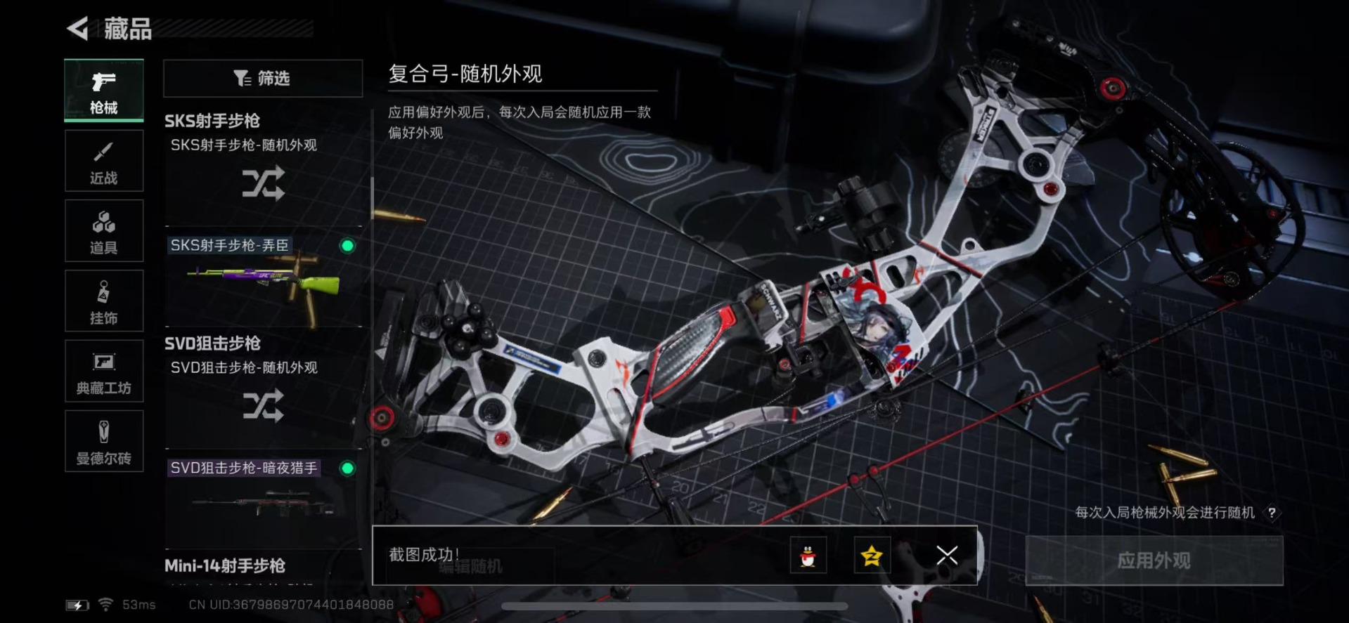 [11472288]总资产:128.8 1传说枪械 顶级安全箱(3X3)9.15号到期 烽火地带段位:钻石 全面战场段位:无段位 哈夫币:3.7 传说武器皮肤:复合弓-黑-天际线 史诗武器皮肤:M1014霰弹枪-林中猎手,SV-98狙击步枪-林中猎手,S12K霰弹枪-曙光