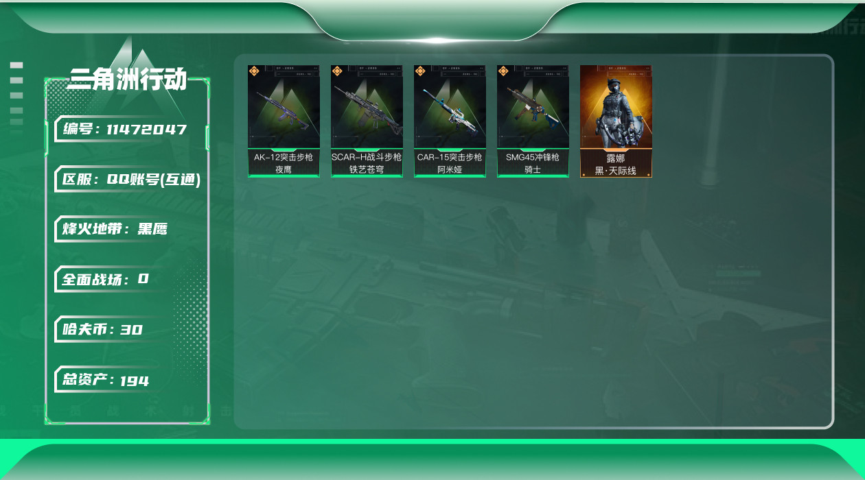 [11472047]可二次 可修改实名 实名:可修改 烽火地带段位:黑鹰 全面战场段位:上等兵 总资产:194.1 哈夫币:30.880 传说武器皮肤:SCAR-H战斗步枪-铁艺苍穹,AK-12突击步枪-夜鹰,SMG45冲锋枪-骑士,CAR-15突击步枪-阿米娅 干员外观:露娜-黑·天际线