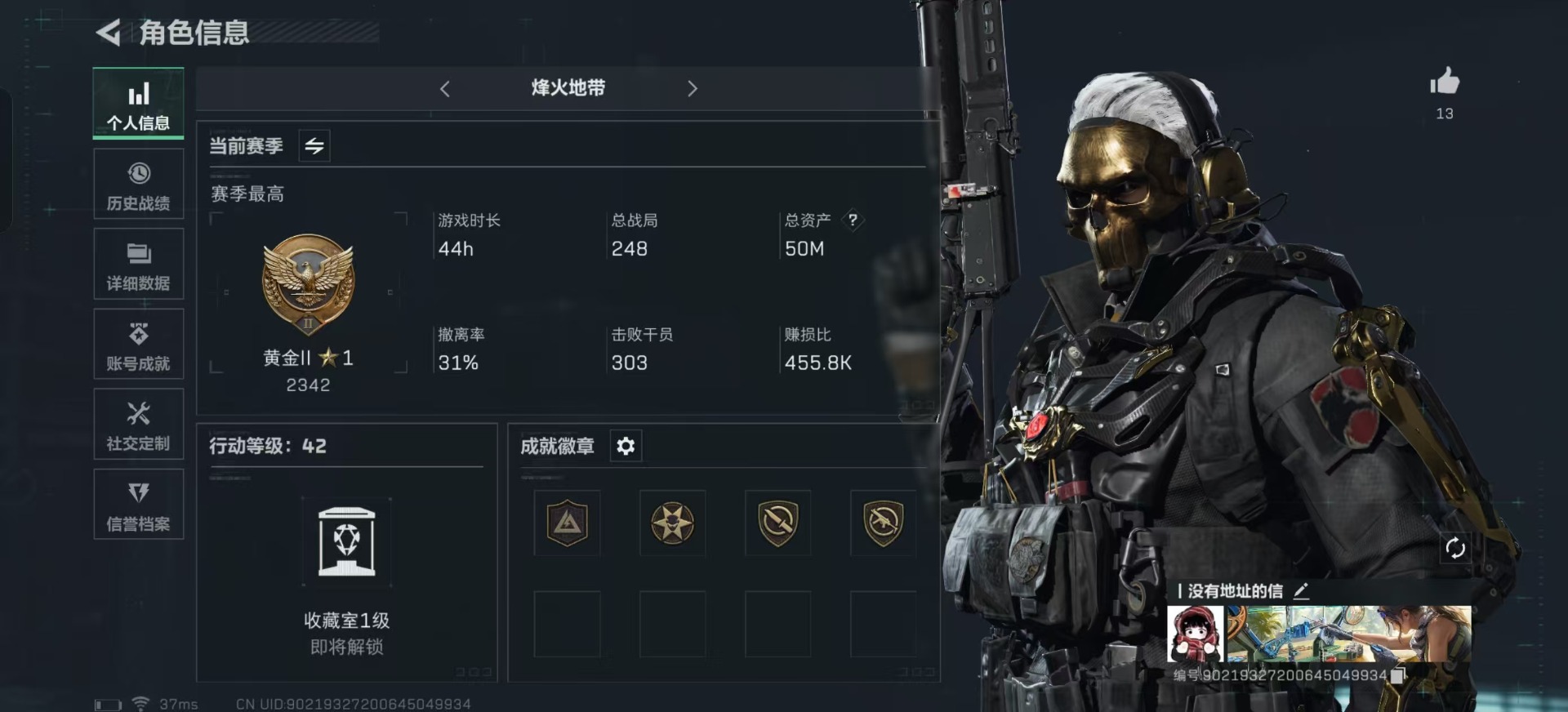 [11472237]总资产:50 1干员外观 4传说枪械 段位:无段位 可二次 可修改实名 烽火地带段位:黄金 全面战场段位:无段位 哈夫币:891.351 传说武器皮肤:复合弓-黑-天际线,CAR-15突击步枪-阿米娅,725双管霰弹枪-送葬人-无题密令,M4A1突击步枪-蚀金玫瑰 干员外观:红狼-蚀金玫瑰