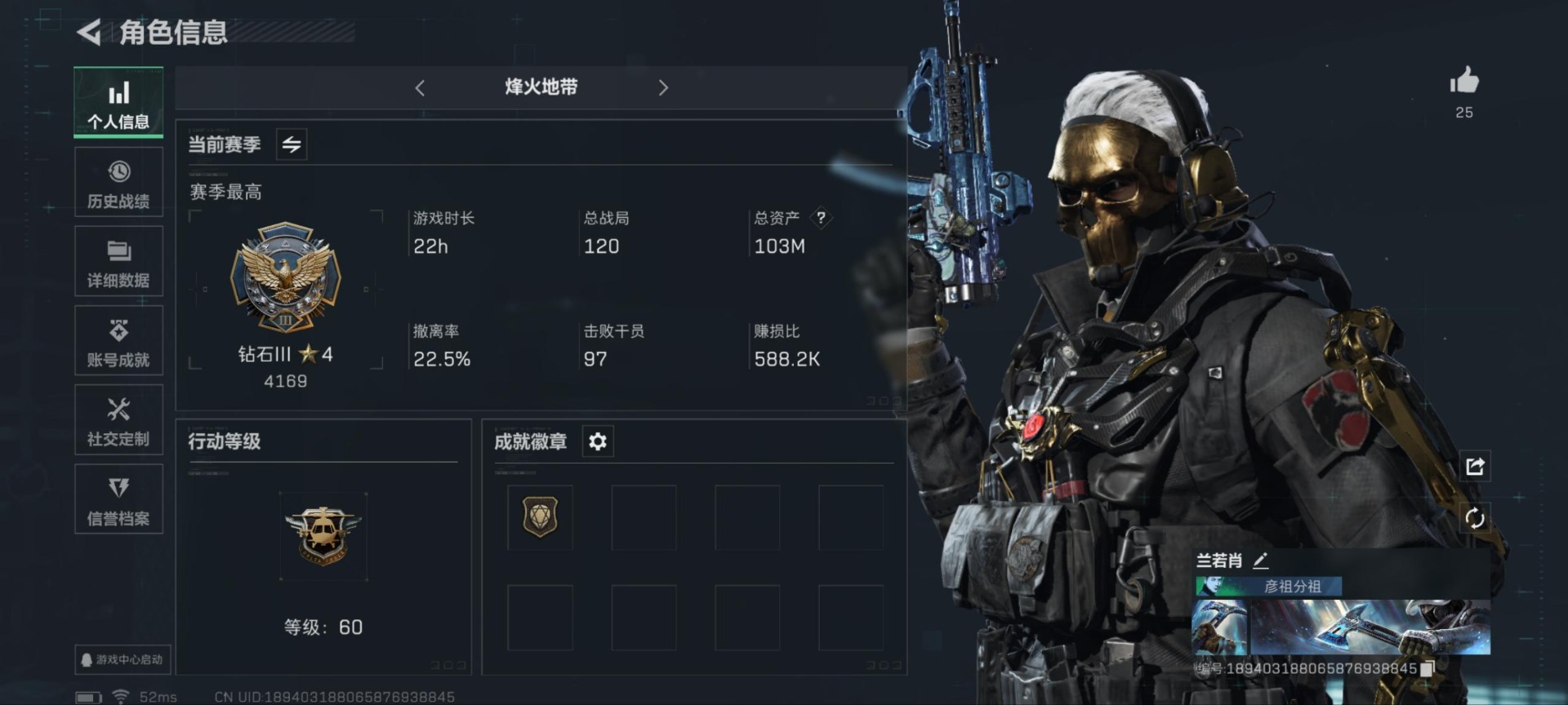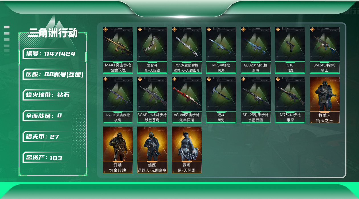 [11471424]总资产:103 4干员外观 1近战传说 13传说枪械 高级安全箱(2×3)9.15号到期 可二次 可修改实名 优质装备:近战-黑海 烽火地带段位:钻石 全面战场段位:上等兵 哈夫币:27.840 传说武器皮肤:AS Val突击步枪-蛇年祥瑞,SR-25射手步枪-水墨云图,SCAR-H战斗步枪-铁艺苍穹,G18-飞虎,SMG45冲锋枪-骑士,AK-12突击步枪-夜鹰,复合弓-黑-天际线,725双管霰弹枪-送葬人-无题密令,QJB201轻机枪-黑海,MP5冲锋枪-黑海,M7战斗步枪-维京,M4A1突击步枪-蚀金玫瑰 干员外观:红狼-蚀金玫瑰,牧羊人-街头之王,蜂医-送葬人·无题密令(S5),露娜-黑·天际线