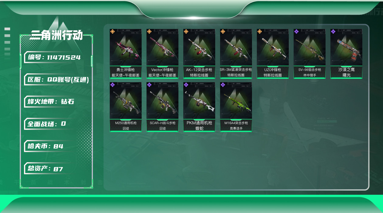 [11471524]总资产:87.3M 5传说枪械 哈夫币:84.999K 可二次 可修改实名 烽火地带段位:钻石 全面战场段位:无段位 传说武器皮肤:AK-12突击步枪-特斯拉线圈,SR-3M紧凑突击步枪-特斯拉线圈,UZI冲锋枪-特斯拉线圈,勇士冲锋枪-能天使-午夜邮差,Vector冲锋枪-能天使-午夜邮差 史诗武器皮肤:PKM通用机枪-蝮蛇,M16A4突击步枪-竞赛选手,SV-98狙击步枪-林中猎手,M250通用机枪-囚徒,SCAR-H战斗步枪-囚徒,沙漠之鹰-曙光