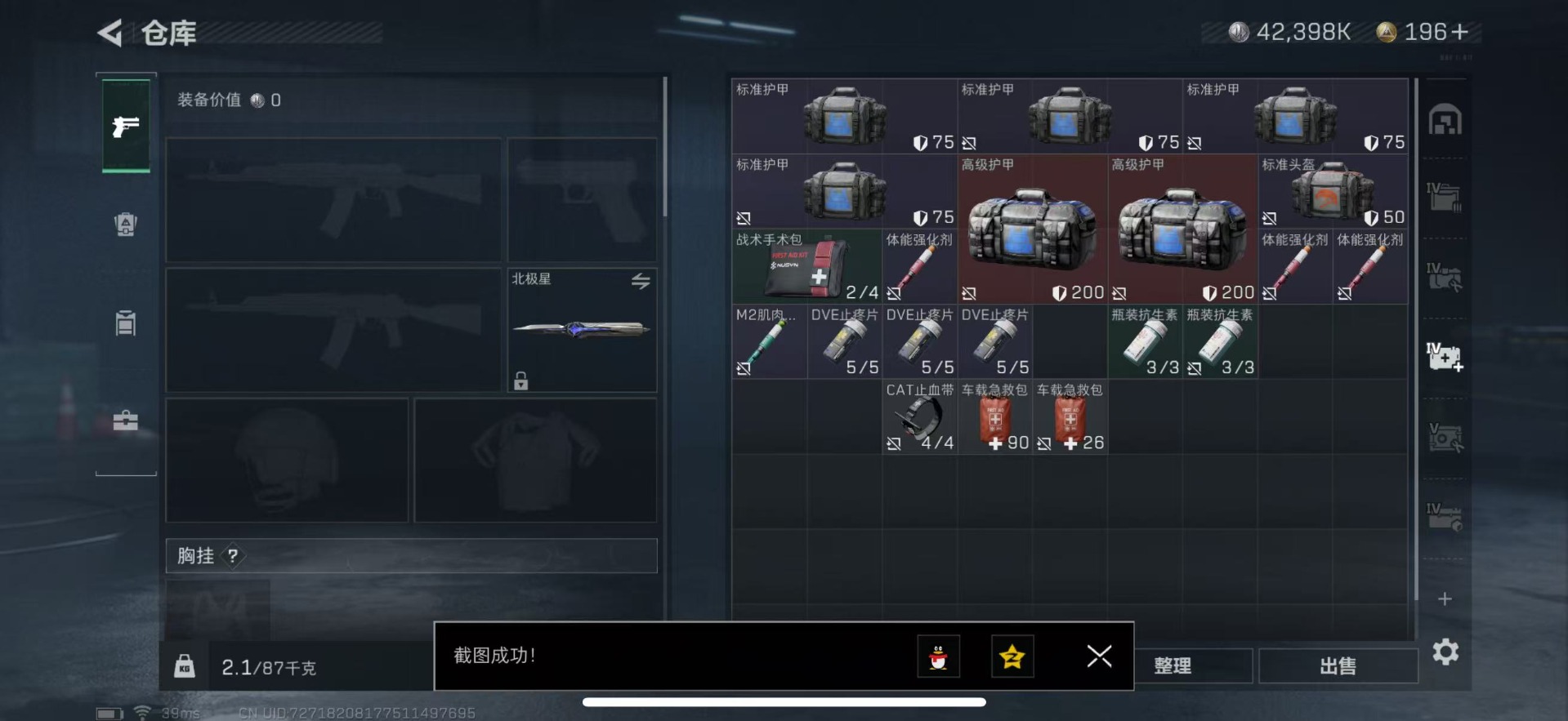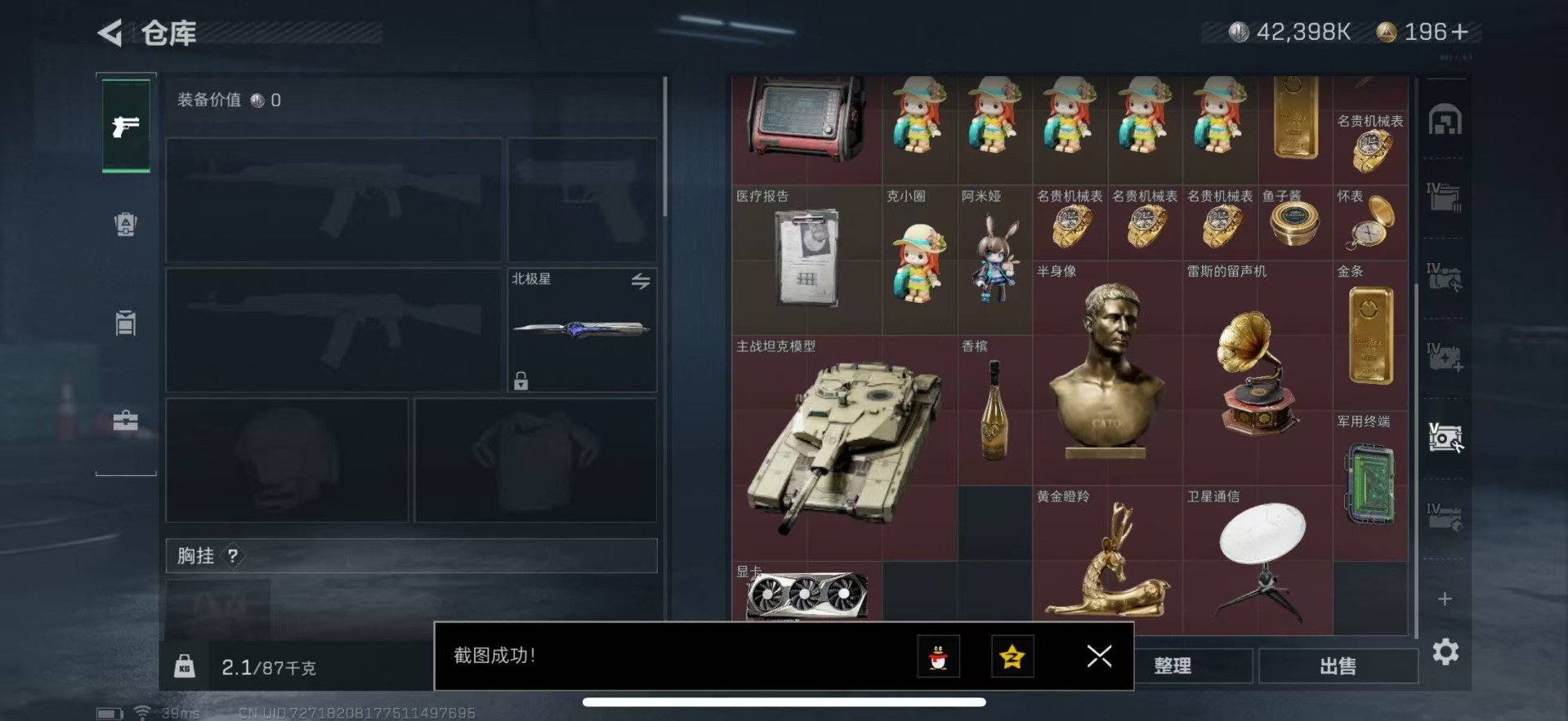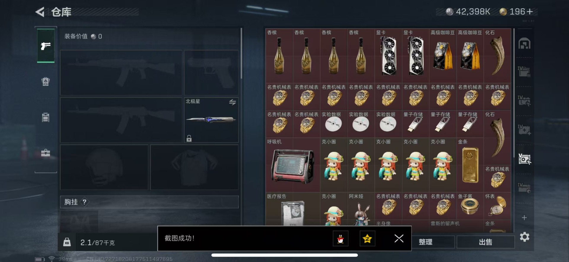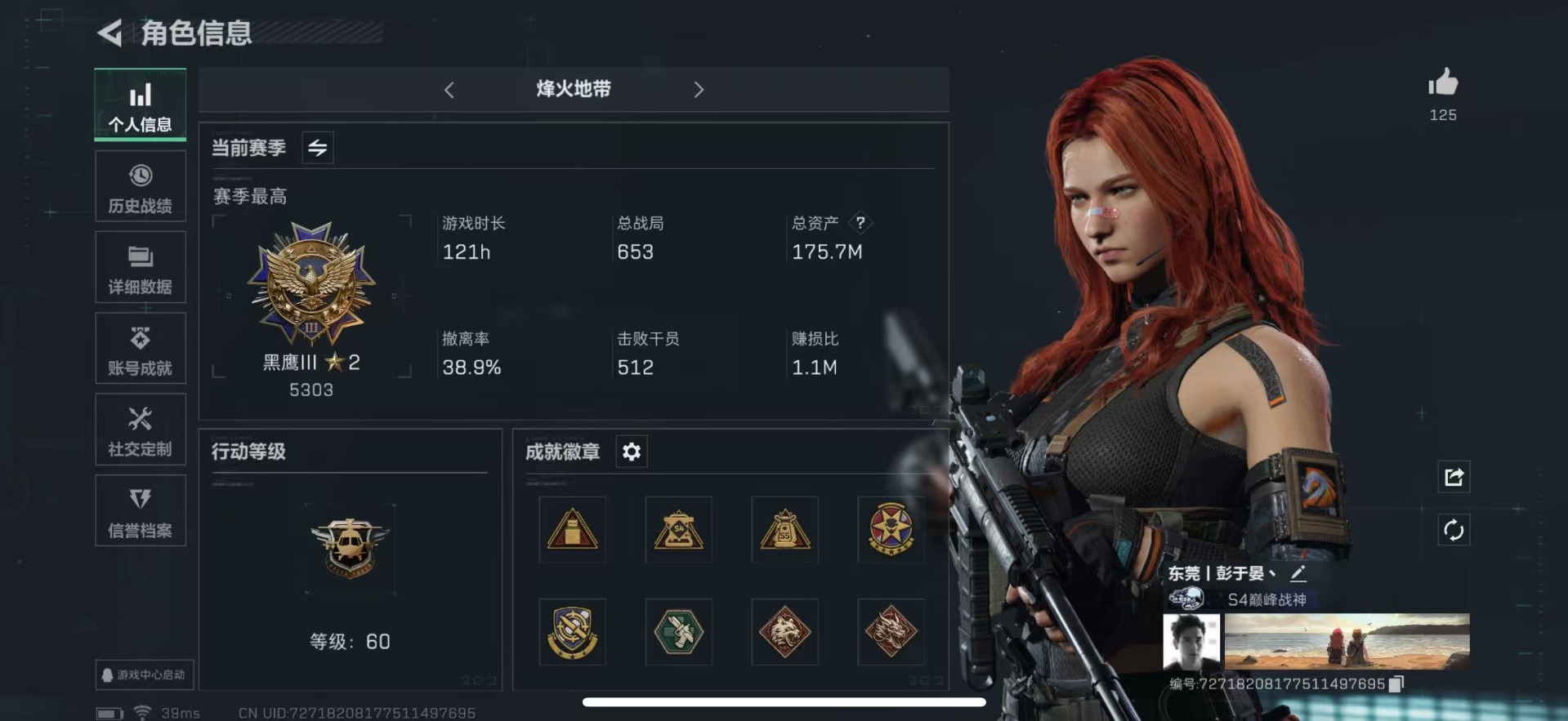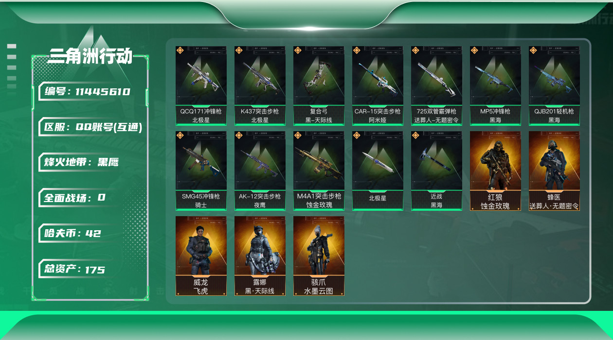 [11445610]可二次 可修改实名 实名:可修改 顶级安全箱(9.17到期) 烽火地带段位:黑鹰 全面战场段位:无段位 总资产:175.7 哈夫币:42.398 传说武器皮肤:近战-黑海,近战-北极星,AK-12突击步枪-夜鹰,SMG45冲锋枪-骑士,QJB201轻机枪-黑海,MP5冲锋枪-黑海,复合弓-黑-天际线,CAR-15突击步枪-阿米娅,725双管霰弹枪-送葬人-无题密令,QCQ171冲锋枪-北极星,K437突击步枪-北极星,M4A1突击步枪-蚀金玫瑰 干员外观:红狼-蚀金玫瑰,骇爪-水墨云图,威龙-飞虎,蜂医-送葬人·无题密令(S5),露娜-黑·天际线