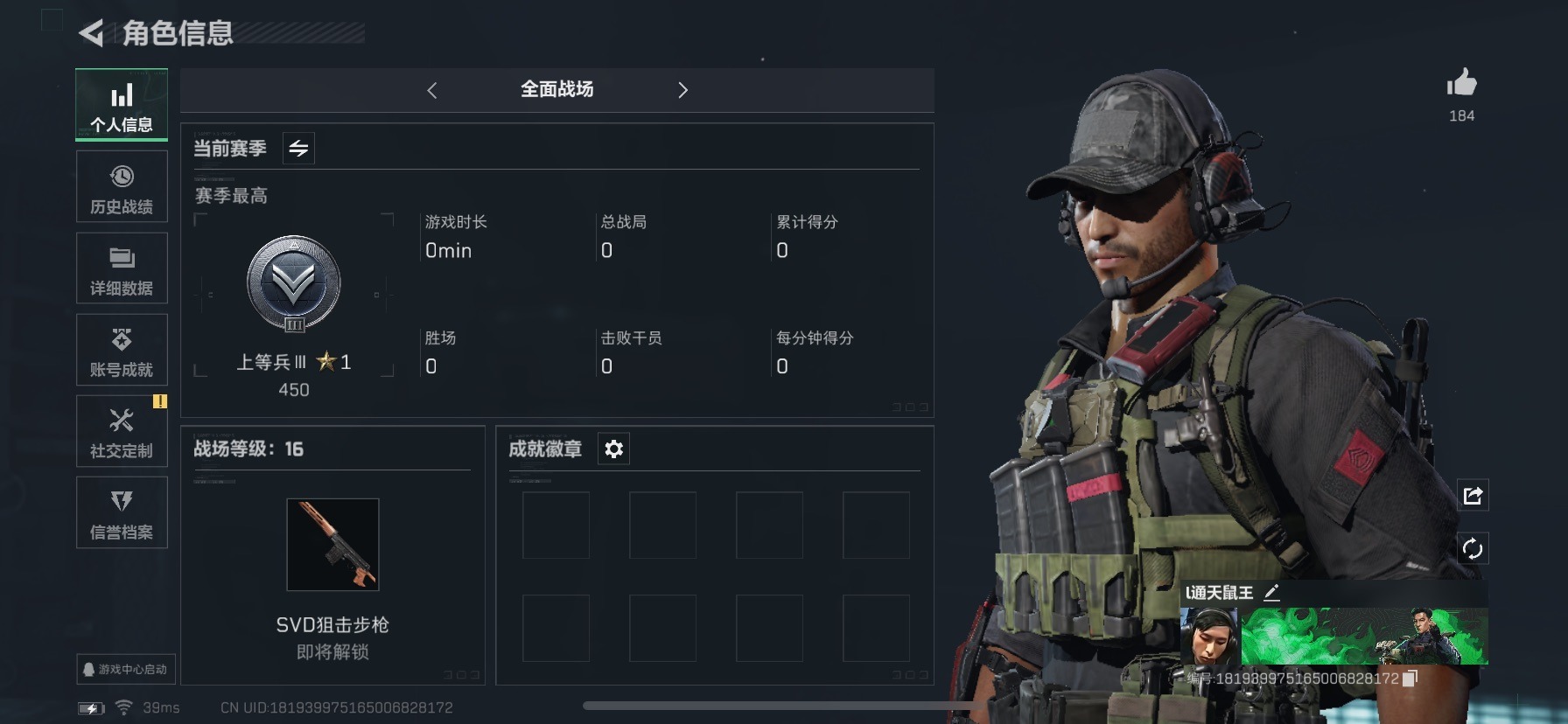 - [11239356]实名: 可修改 时装数: 340 枪械数: 109 战备数: 63 热门装扮: 派对舞王,未来领航者 稀有枪皮: DP-28暗夜鎏金,GROZA-镜光银凌,Kar98K-巳巳如意,AUG-暖羊咩咩,DP-28-豹影疾电