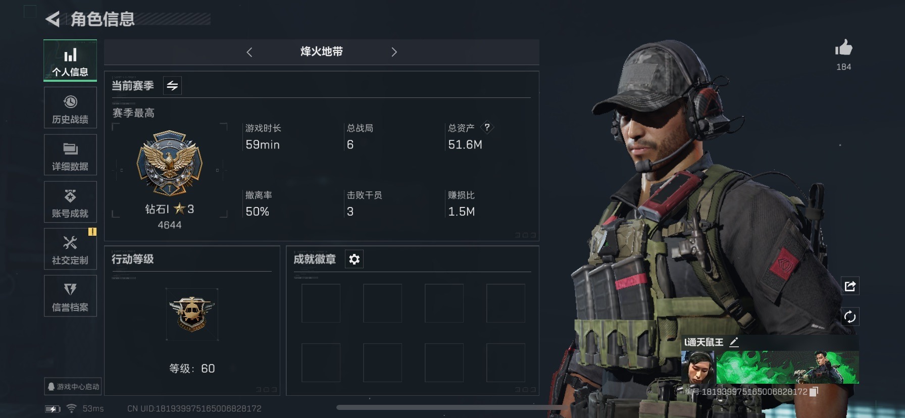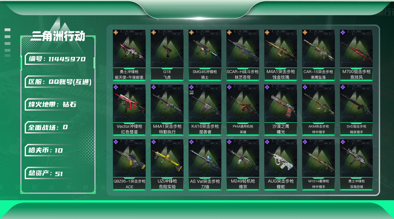 [11445970]总资产:51.6 1干员外观 6传说枪械 可二次 可修改实名 烽火地带段位:钻石 全面战场段位:上等兵 哈夫币:10.321 传说武器皮肤:SCAR-H战斗步枪-铁艺苍穹,G18-飞虎,SMG45冲锋枪-骑士,M4A1突击步枪-蚀金玫瑰,CAR-15突击步枪-黑鹰坠落,勇士冲锋枪-能天使-午夜邮差 史诗武器皮肤:K416突击步枪-潜袭者,QBZ95-1突击步枪-ACE,M4A1突击步枪-特勤执行,AUG突击步枪-特勤执行,Vector冲锋枪-红色彗星,PTR-32战斗步枪-ACE,SKS射手步枪-ACE,AUG突击步枪-蝮蛇,PKM通用机枪-蝮蛇,G3战斗步枪-战场英杰,勇士冲锋枪-深海恐惧,AKM突击步枪-林中猎手,SVD狙击步枪-暗夜猎手,M1014霰弹枪-林中猎手,UZI冲锋枪-危险实验,M249轻机枪-维京,沙漠之鹰-曙光,AS Val突击步枪-刀锋,PKM通用机枪-英雄,M700狙击步枪-竞技风 干员外观:红狼-蚀金玫瑰