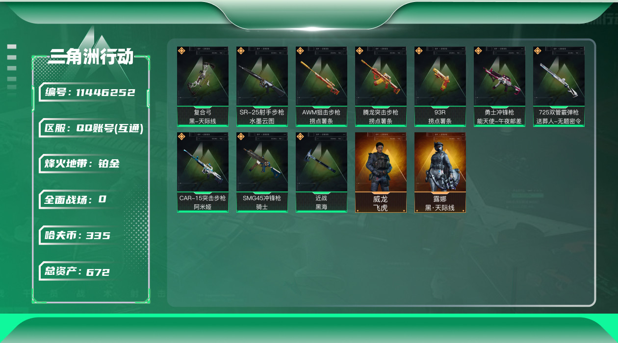 [11446252]总资产:672.3M 2干员外观 1近战传说 10传说枪械 哈夫币:335K 顶级安全箱(3×3)9.15号到期 可二次 可修改实名 优质装备:近战-黑海,顶级安全箱(3x3) 烽火地带段位:铂金 全面战场段位:上等兵 传说武器皮肤:SR-25射手步枪-水墨云图,SMG45冲锋枪-骑士,CAR-15突击步枪-阿米娅,复合弓-黑-天际线,AWM狙击步枪-捞点薯条,腾龙突击步枪-捞点薯条,93R-捞点薯条,勇士冲锋枪-能天使-午夜邮差,725双管霰弹枪-送葬人-无题密令 干员外观:威龙-飞虎,露娜-黑·天际线