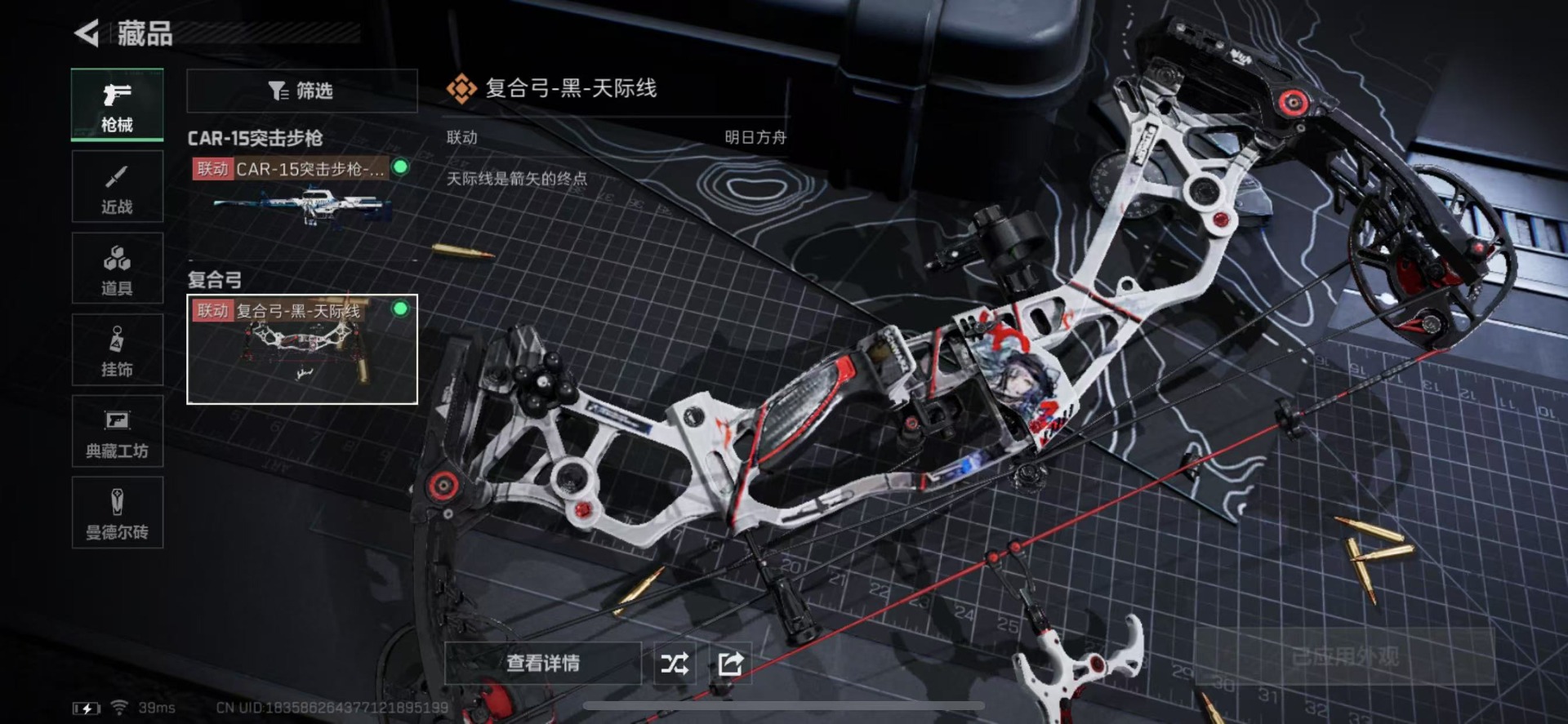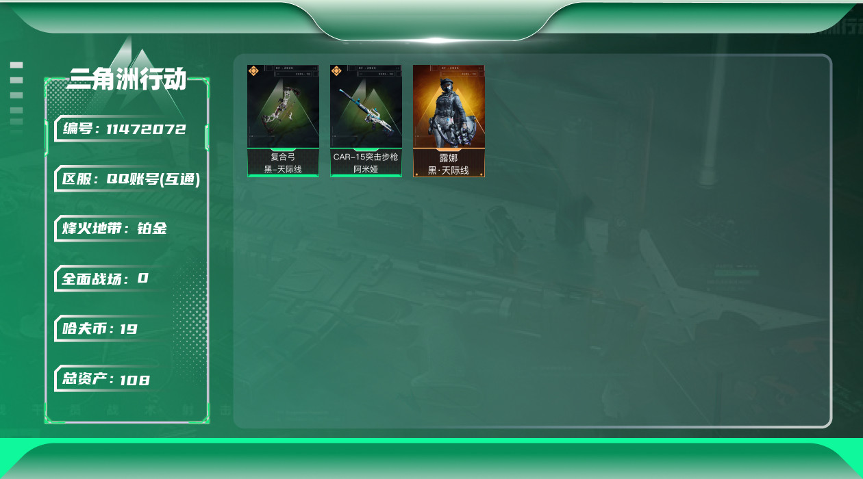 [11472072]总资产:108.5 1干员外观 2传说枪械 顶级安全箱(3×3)9.15号到期 可二次 可修改实名 烽火地带段位:铂金 全面战场段位:列兵 哈夫币:19.825 传说武器皮肤:复合弓-黑-天际线,CAR-15突击步枪-阿米娅 干员外观:露娜-黑·天际线