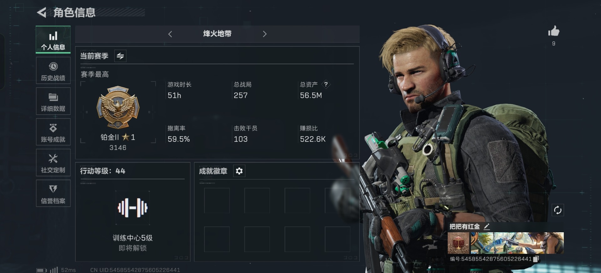 [11444351]总资产:56.5M 2传说枪械 哈夫币:40.162K 进阶安全箱(2×2)9.15号到期 可二次 可修改实名 烽火地带段位:铂金 全面战场段位:无段位 传说武器皮肤:勇士冲锋枪-能天使-午夜邮差,复合弓-黑-天际线 史诗武器皮肤:PKM通用机枪-蝮蛇,M16A4突击步枪-竞赛选手,SVD狙击步枪-阿萨拉工艺