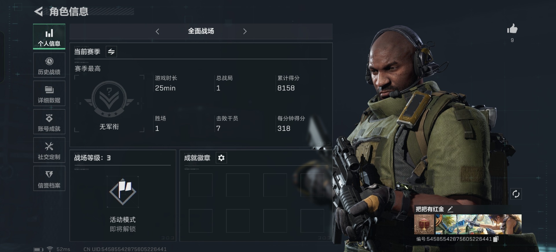 - [11489199]总资产:179.8M 3干员外观 2近战传说 21传说枪械 哈夫币:57.480K 高级安全箱(9.17到期) 可二次 可修改实名 优质装备:近战-怜悯,近战-影锋,AUG突击步枪-气象感应(典藏) 烽火地带段位:钻石 全面战场段位:上等兵 传说武器皮肤:SR-25射手步枪-水墨云图,M1014霰弹枪-影锋,AWM狙击步枪-影锋,SCAR-H战斗步枪-铁艺苍穹,CAR-15突击步枪-阿米娅,复合弓-黑-天际线,AWM狙击步枪-捞点薯条,腾龙突击步枪-捞点薯条,93R-捞点薯条,AK-12突击步枪-特斯拉线圈,SR-3M紧凑突击步枪-特斯拉线圈,UZI冲锋枪-特斯拉线圈,勇士冲锋枪-能天使-午夜邮差,725双管霰弹枪-送葬人-无题密令,M7战斗步枪-神秘艺术,M7战斗步枪-维京,M7战斗步枪-怜悯,ASh-12战斗步枪-怜悯 史诗武器皮肤:QBZ95-1突击步枪-ACE,M4A1突击步枪-特勤执行,AUG突击步枪-特勤执行,PTR-32战斗步枪-ACE,SKS射手步枪-ACE,AUG突击步枪-蝮蛇,M700狙击步枪-蝮蛇,G3战斗步枪-战场英杰,SVD狙击步枪-暗夜猎手,M16A4突击步枪-竞赛选手,勇士冲锋枪-深海恐惧,AKM突击步枪-林中猎手,SR-3M紧凑突击步枪-荒野求生,M1014霰弹枪-林中猎手,PTR-32突击步枪-英雄,M250通用机枪-囚徒,腾龙突击步枪-无垢,MP7冲锋枪-无垢,PSG-1射手步枪-无垢,QBZ95-1突击步枪-曙光,UZI冲锋枪-危险实验,M249轻机枪-维京,SCAR-H战斗步枪-危险实验,Vector冲锋枪-阿萨拉文明,PKM通用机枪-英雄,M700狙击步枪-竞技风,QSZ92G-风林火山,93R-博士 干员外观:牧羊人-街头之王,威龙-壮志凌云,蜂医-送葬人·无题密令(S5)