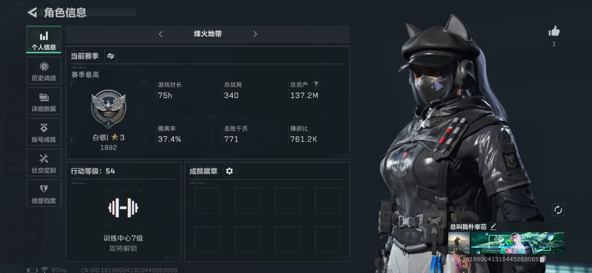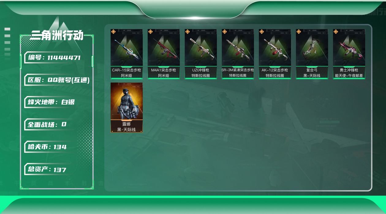 [11444471]总资产:137.2M 1干员外观 7传说枪械 哈夫币:134K 进阶安全箱(2×2)9.15号到期 可二次 可修改实名 烽火地带段位:白银 全面战场段位:无段位 传说武器皮肤:AK-12突击步枪-特斯拉线圈,CAR-15突击步枪-阿米娅,SR-3M紧凑突击步枪-特斯拉线圈,UZI冲锋枪-特斯拉线圈,勇士冲锋枪-能天使-午夜邮差,复合弓-黑-天际线,M4A1突击步枪-阿米娅 干员外观:露娜-黑·天际线