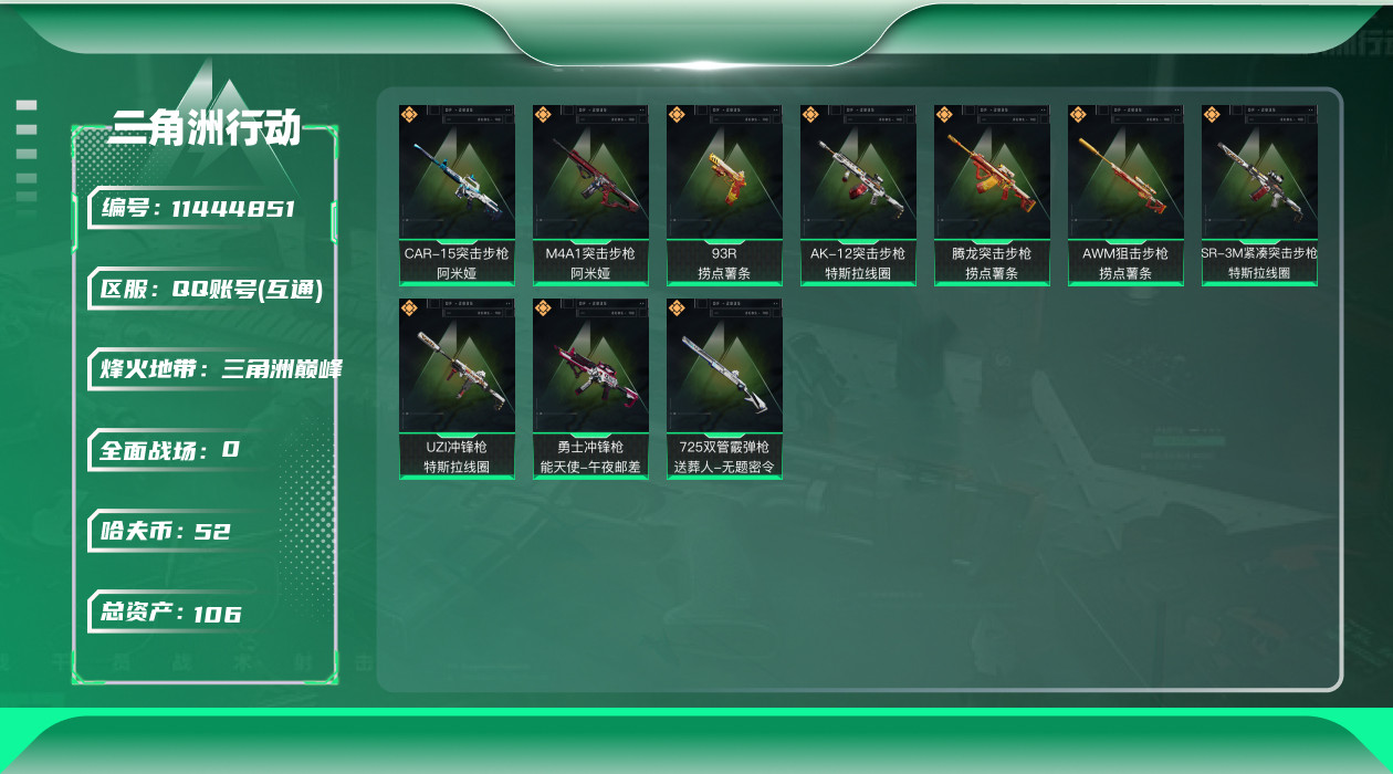 [11444851]总资产:106.4M 10传说枪械 哈夫币:52.525K 可二次 可修改实名 烽火地带段位:三角洲巅峰 全面战场段位:无段位 传说武器皮肤:93R-捞点薯条,AWM狙击步枪-捞点薯条,腾龙突击步枪-捞点薯条,AK-12突击步枪-特斯拉线圈,CAR-15突击步枪-阿米娅,SR-3M紧凑突击步枪-特斯拉线圈,UZI冲锋枪-特斯拉线圈,勇士冲锋枪-能天使-午夜邮差,M4A1突击步枪-阿米娅,725双管霰弹枪-送葬人-无题密令