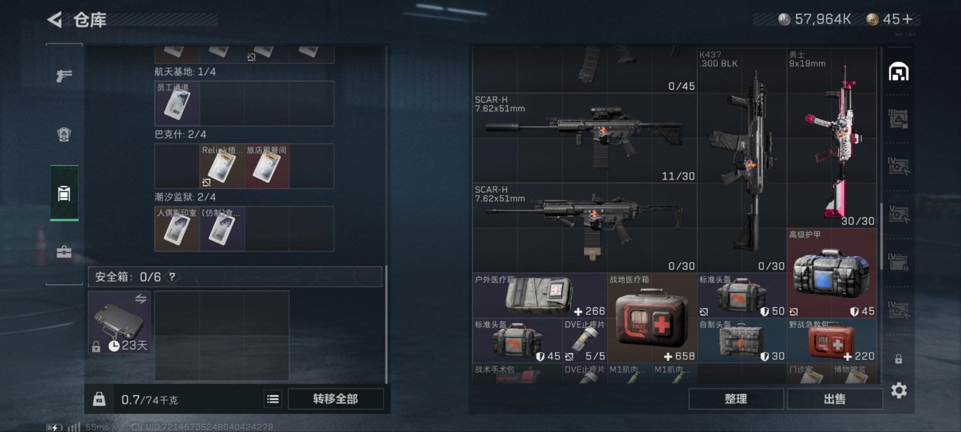 - [11524696]总资产:9 1近战传说 5传说枪械 高级安全箱(9.17到期) 可二次 可修改实名 烽火地带段位:钻石 全面战场段位:列兵 哈夫币:0 传说武器皮肤:近战-黑海,SMG45冲锋枪-骑士,QJB201轻机枪-黑海,复合弓-黑-天际线,M4A1突击步枪-蚀金玫瑰 史诗武器皮肤:QBZ95-1突击步枪-ACE,M4A1突击步枪-特勤执行,SKS射手步枪-ACE,PKM通用机枪-蝮蛇,PKM通用机枪-荒野求生,M700狙击步枪-守夜人,MP5冲锋枪-深海恐惧,勇士冲锋枪-深海恐惧,AKM突击步枪-林中猎手,SVD狙击步枪-暗夜猎手,M1014霰弹枪-林中猎手,PSG-1射手步枪-无垢,SV-98狙击步枪-囚徒,QBZ95-1突击步枪-曙光,沙漠之鹰-曙光,M700狙击步枪-竞技风