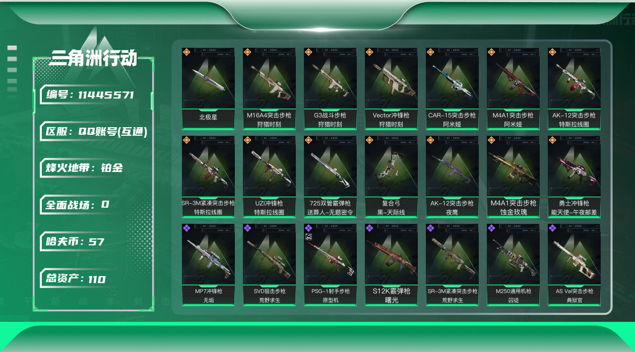 [11445571]总资产:110M 2干员外观 1近战传说 14传说枪械 哈夫币:57.964K 高级安全箱(9.17到期) 可二次 可修改实名 优质装备:近战-北极星 烽火地带段位:铂金 全面战场段位:无段位 传说武器皮肤:AK-12突击步枪-夜鹰,M16A4突击步枪-狩猎时刻,M4A1突击步枪-阿米娅,CAR-15突击步枪-阿米娅,复合弓-黑-天际线,Vector冲锋枪-狩猎时刻,G3战斗步枪-狩猎时刻,AK-12突击步枪-特斯拉线圈,SR-3M紧凑突击步枪-特斯拉线圈,UZI冲锋枪-特斯拉线圈,勇士冲锋枪-能天使-午夜邮差,725双管霰弹枪-送葬人-无题密令,M4A1突击步枪-蚀金玫瑰 史诗武器皮肤:PSG-1射手步枪-原型机(典藏),PKM通用机枪-守夜人,AS Val突击步枪-尖端治疗,M700狙击步枪-守夜人,PKM通用机枪-荒野求生,勇士冲锋枪-深海恐惧,AKM突击步枪-林中猎手,SR-3M紧凑突击步枪-荒野求生,M1014霰弹枪-林中猎手,SV-98狙击步枪-林中猎手,SVD狙击步枪-荒野求生,AS Val突击步枪-典狱官,M250通用机枪-囚徒,SCAR-H战斗步枪-囚徒,MP7冲锋枪-无垢,PSG-1射手步枪-无垢,S12K霰弹枪-曙光 干员外观:红狼-蚀金玫瑰,露娜-黑·天际线