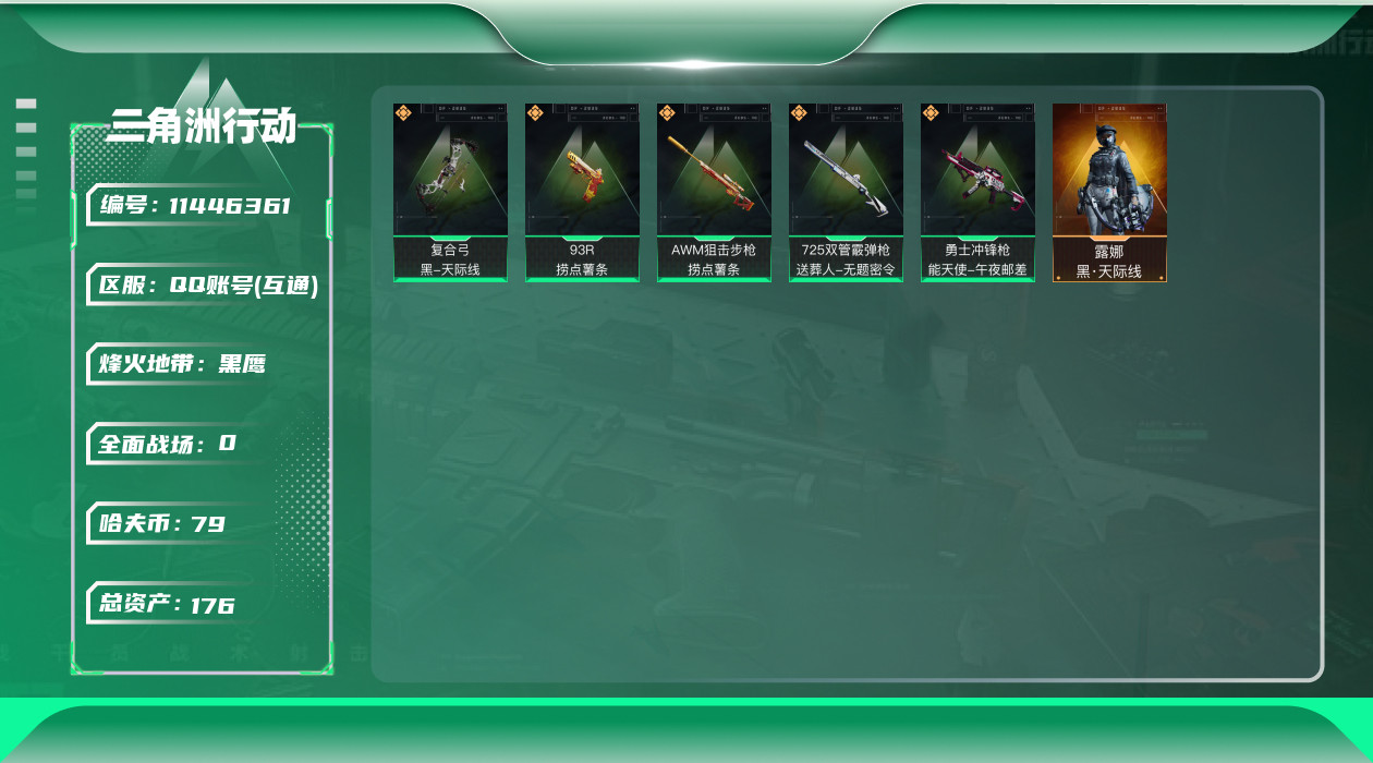 [11446361]总资产:176.9M 1干员外观 5传说枪械 哈夫币:79.903K 高级安全箱(9.17到期) 可二次 可修改实名 烽火地带段位:黑鹰 全面战场段位:军士长 传说武器皮肤:复合弓-黑-天际线,AWM狙击步枪-捞点薯条,93R-捞点薯条,勇士冲锋枪-能天使-午夜邮差,725双管霰弹枪-送葬人-无题密令 干员外观:露娜-黑·天际线