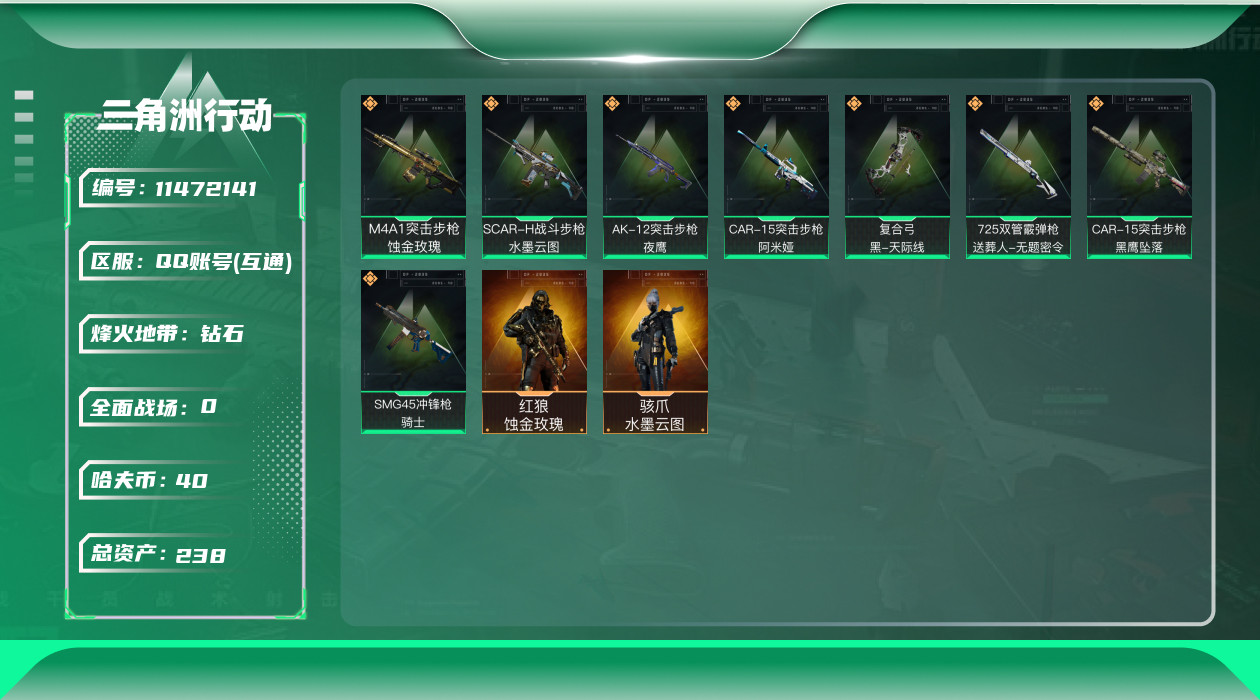 [11472141]可二次 可修改实名 实名:可修改 顶级安全箱(9.17到期) 烽火地带段位:钻石 全面战场段位:上等兵 总资产:238 哈夫币:40.069 传说武器皮肤:SCAR-H战斗步枪-水墨云图,AK-12突击步枪-夜鹰,SMG45冲锋枪-骑士,复合弓-黑-天际线,CAR-15突击步枪-阿米娅,725双管霰弹枪-送葬人-无题密令,M4A1突击步枪-蚀金玫瑰,CAR-15突击步枪-黑鹰坠落 干员外观:红狼-蚀金玫瑰,骇爪-水墨云图