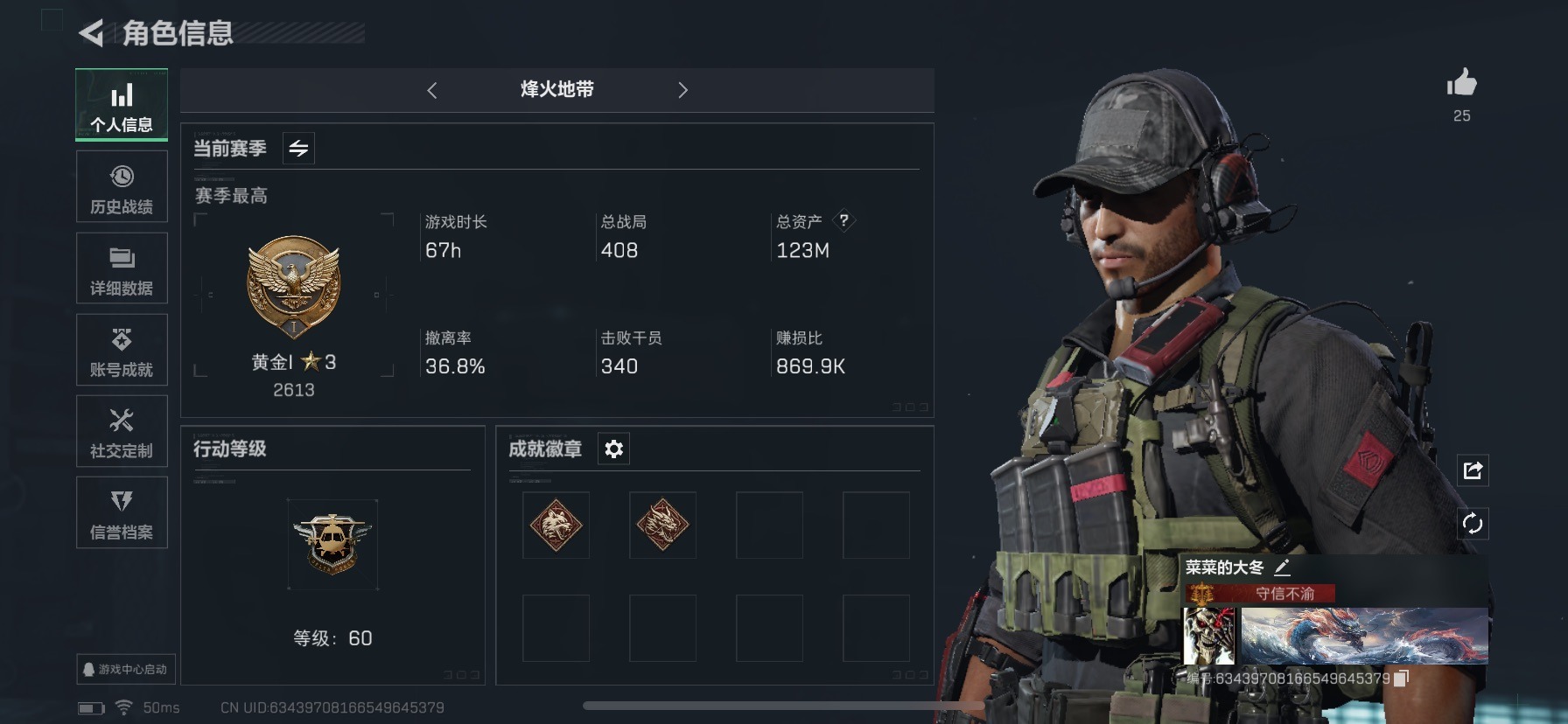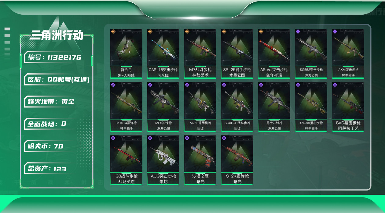 [11322176]总资产:123M 5传说枪械 哈夫币:70.159K 顶级安全箱(3×3)9.15号到期 可二次 可修改实名 优质装备:顶级安全箱(3x3) 烽火地带段位:黄金 全面战场段位:上等兵 传说武器皮肤:AS Val突击步枪-蛇年祥瑞,SR-25射手步枪-水墨云图,CAR-15突击步枪-阿米娅,复合弓-黑-天际线,M7战斗步枪-神秘艺术 史诗武器皮肤:AUG突击步枪-蝮蛇,G3战斗步枪-战场英杰,MP5冲锋枪-深海恐惧,勇士冲锋枪-深海恐惧,SG552突击步枪-深海恐惧,AKM突击步枪-林中猎手,M1014霰弹枪-林中猎手,SV-98狙击步枪-林中猎手,M250通用机枪-囚徒,SCAR-H战斗步枪-囚徒,沙漠之鹰-曙光,SVD狙击步枪-阿萨拉工艺,S12K霰弹枪-曙光