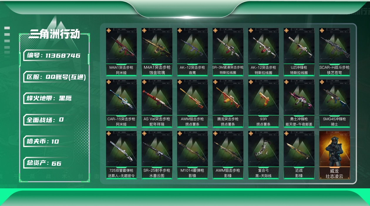 [11368746]总资产:66.5M 3干员外观 1近战传说 20传说枪械 哈夫币:10.076K 高级安全箱(2×3)9.15号到期 可二次 可修改实名 优质装备:近战-影锋 烽火地带段位:黑鹰 全面战场段位:军士长 传说武器皮肤:AS Val突击步枪-蛇年祥瑞,SR-25射手步枪-水墨云图,M1014霰弹枪-影锋,AWM狙击步枪-影锋,SCAR-H战斗步枪-铁艺苍穹,AK-12突击步枪-夜鹰,SMG45冲锋枪-骑士,M4A1突击步枪-阿米娅,CAR-15突击步枪-阿米娅,复合弓-黑-天际线,AWM狙击步枪-捞点薯条,腾龙突击步枪-捞点薯条,93R-捞点薯条,AK-12突击步枪-特斯拉线圈,SR-3M紧凑突击步枪-特斯拉线圈,UZI冲锋枪-特斯拉线圈,勇士冲锋枪-能天使-午夜邮差,725双管霰弹枪-送葬人-无题密令,M4A1突击步枪-蚀金玫瑰 干员外观:红狼-蚀金玫瑰,威龙-壮志凌云,露娜-黑·天际线