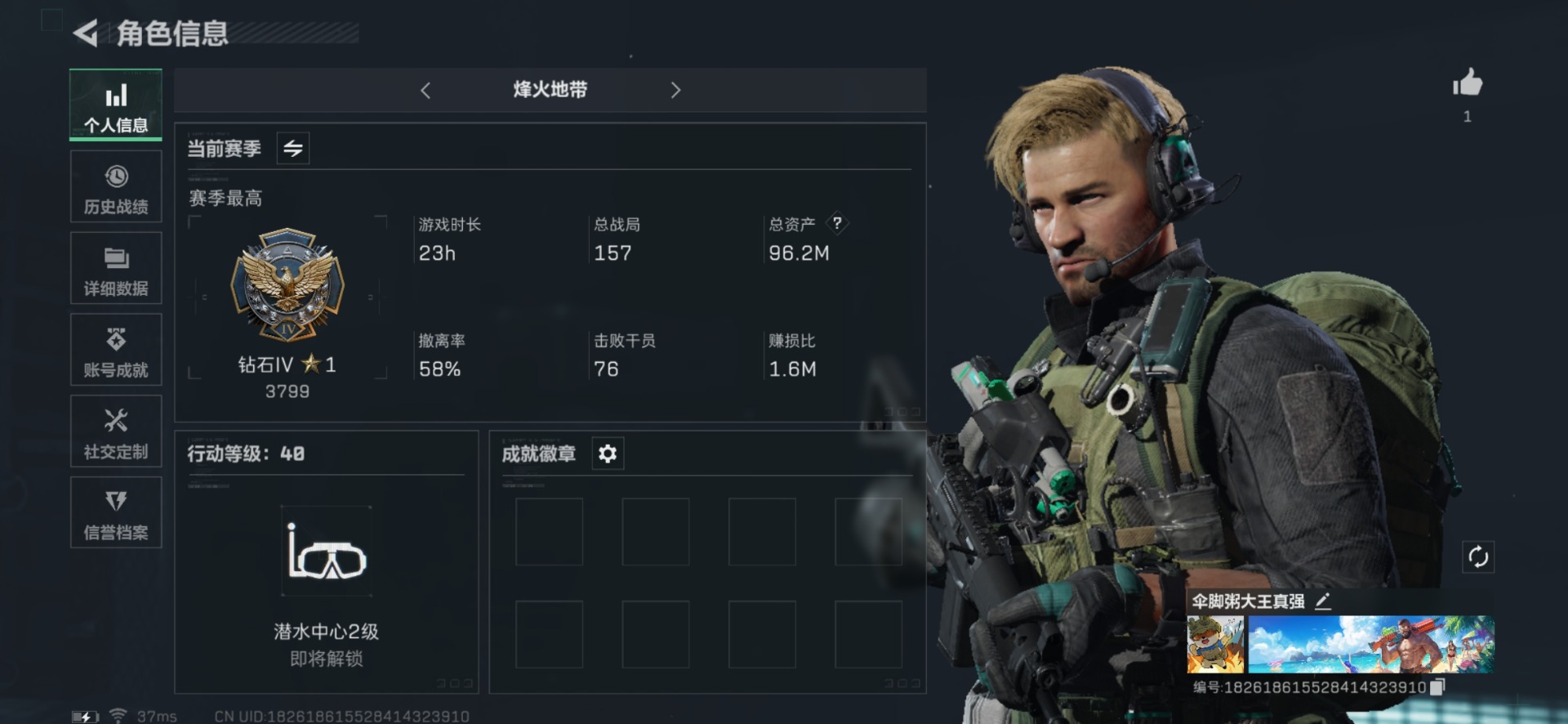 - [11526638]总资产:174.2M 1干员外观 1近战传说 8传说枪械 哈夫币:13.460K 可二次 可修改实名 优质装备:近战-北极星 烽火地带段位:铂金 全面战场段位:无段位 传说武器皮肤:勇士冲锋枪-能天使-午夜邮差,复合弓-黑-天际线,K437突击步枪-北极星,QCQ171冲锋枪-北极星,M4A1突击步枪-阿米娅,CAR-15突击步枪-阿米娅,M4A1突击步枪-蚀金玫瑰 干员外观:红狼-蚀金玫瑰