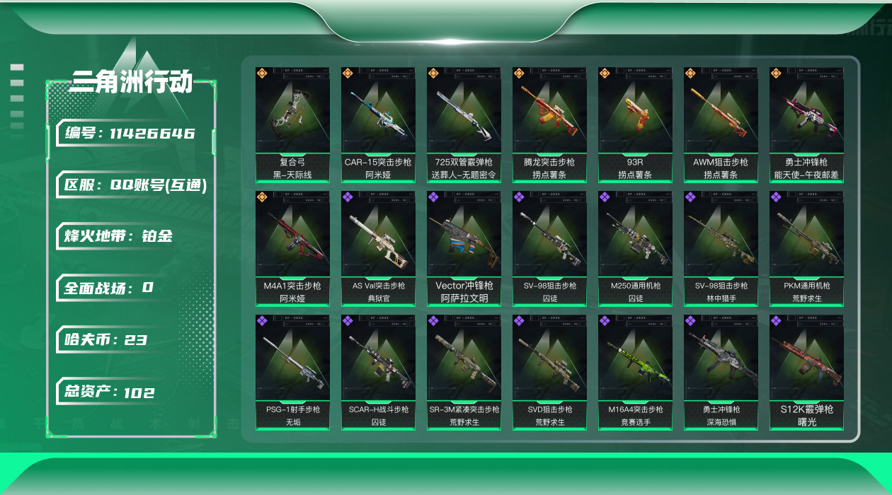 - [11605834]总资产:200M 10传说枪械 哈夫币:104K 可二次 可修改实名 优质装备:顶级安全箱(3x3) 烽火地带段位:铂金 全面战场段位:军士长 传说武器皮肤:UZI冲锋枪-特斯拉线圈,AWM狙击步枪-捞点薯条,腾龙突击步枪-捞点薯条,93R-捞点薯条,AK-12突击步枪-特斯拉线圈,SR-3M紧凑突击步枪-特斯拉线圈,勇士冲锋枪-能天使-午夜邮差,复合弓-黑-天际线,725双管霰弹枪-送葬人-无题密令,CAR-15突击步枪-阿米娅 史诗武器皮肤:M700狙击步枪-蝮蛇,M16A4突击步枪-竞赛选手,SV-98狙击步枪-林中猎手,PKM通用机枪-荒野求生,M250通用机枪-囚徒,SV-98狙击步枪-囚徒,SCAR-H战斗步枪-囚徒,腾龙突击步枪-无垢,MP7冲锋枪-无垢,PSG-1射手步枪-无垢,SVD狙击步枪-荒野求生,SR-3M紧凑突击步枪-荒野求生,沙漠之鹰-曙光,Vector冲锋枪-阿萨拉文明,S12K霰弹枪-曙光,M700狙击步枪-竞技风