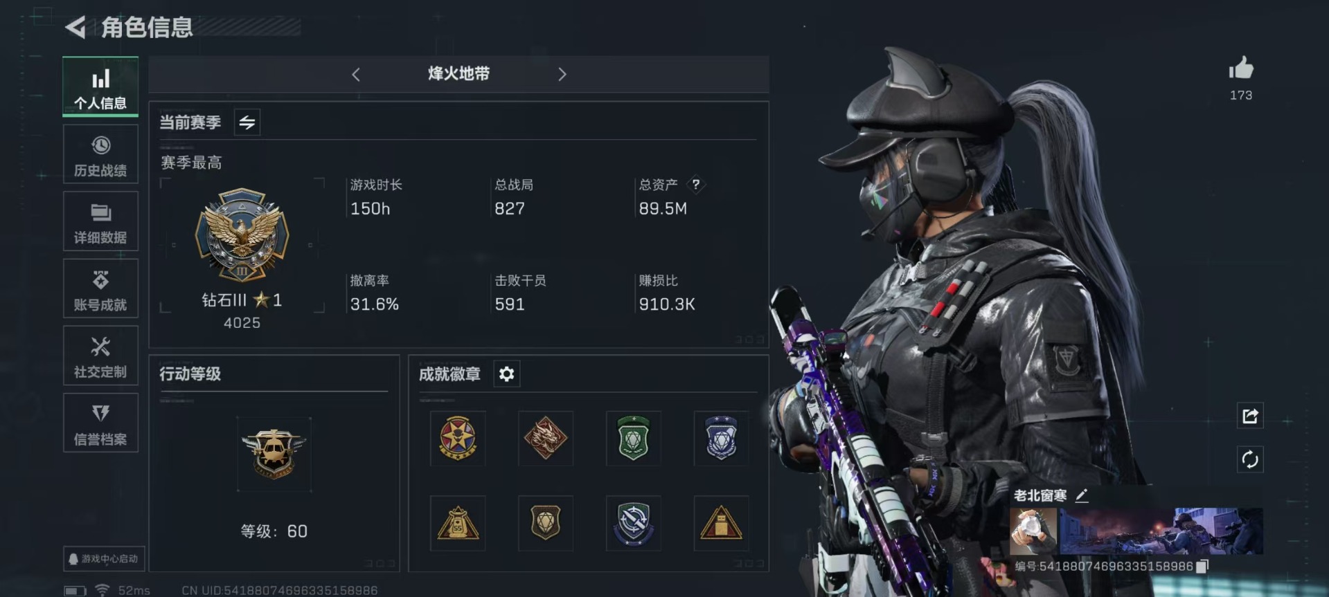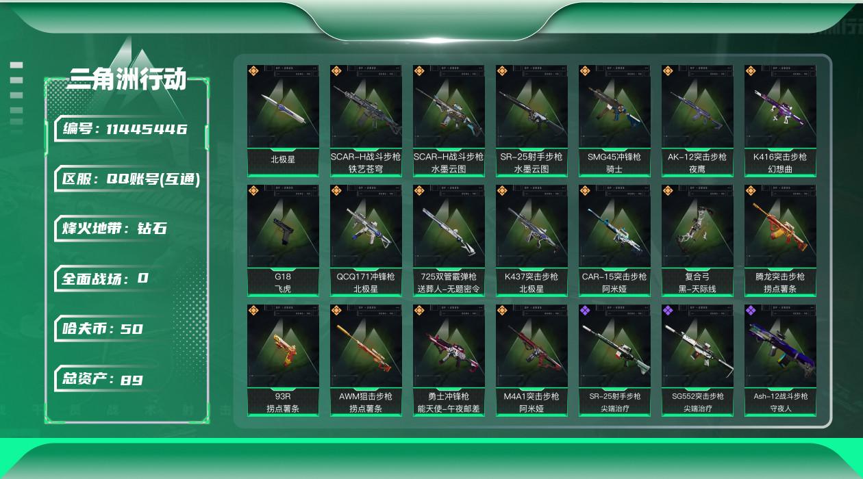 [11445446]总资产:89.5M 5干员外观 1近战传说 18传说枪械 哈夫币:50.145K 顶级安全箱(3×3)9.15号到期 可二次 可修改实名 优质装备:近战-北极星,顶级安全箱(3x3) 烽火地带段位:钻石 全面战场段位:军士长 传说武器皮肤:SR-25射手步枪-水墨云图,SCAR-H战斗步枪-水墨云图,SCAR-H战斗步枪-铁艺苍穹,AK-12突击步枪-夜鹰,G18-飞虎,SMG45冲锋枪-骑士,M4A1突击步枪-阿米娅,CAR-15突击步枪-阿米娅,复合弓-黑-天际线,AWM狙击步枪-捞点薯条,QCQ171冲锋枪-北极星,腾龙突击步枪-捞点薯条,93R-捞点薯条,勇士冲锋枪-能天使-午夜邮差,725双管霰弹枪-送葬人-无题密令,K437突击步枪-北极星,K416突击步枪-幻想曲 史诗武器皮肤:PSG-1射手步枪-原型机(典藏),PKM通用机枪-蝮蛇,SR-25射手步枪-尖端治疗,PKM通用机枪-荒野求生,M700狙击步枪-守夜人,SG552突击步枪-尖端治疗,Ash-12战斗步枪-守夜人,SR-3M紧凑突击步枪-荒野求生,M16A4突击步枪-竞赛选手,SVD狙击步枪-荒野求生,M1014霰弹枪-林中猎手,PTR-32突击步枪-英雄,PSG-1射手步枪-无垢,AS Val突击步枪-典狱官,M250通用机枪-囚徒,SV-98狙击步枪-囚徒,SCAR-H战斗步枪-囚徒,腾龙突击步枪-无垢,MP7冲锋枪-无垢,SCAR-H战斗步枪-危险实验,S12K霰弹枪-曙光 干员外观:威龙-壮志凌云,骇爪-水墨云图,无名-夜鹰,威龙-飞虎,蜂医-送葬人·无题密令(S5)